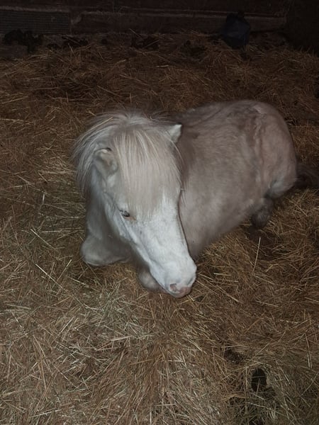 Kruising Fewspot appaloosa X Shetlander Storm is een 4,5 jaar oude ruin van 95-100 cm Geboortedatum 02-02-2021 Hij is helemaal wit, met enkele zwarte stippen Onbeleerd, maar kent het meelopen aan een halster, vaststaan tijdens poetsen, hoofdstelletje. Energiek, nieuwsgierig en heel sociaal! Consequente aanpak nodig, en is gek op aandacht. Braaf bij hoefsmid. Storm heeft aan zijn achterbenen een klein aandachtspuntje. Met de juiste manier van bekappen blijft dit onder controle. Hij heeft er geen last van en hoe meer beweging en spierkracht hij krijgt, hoe minder het zichtbaar is. Zijn hart zit op de juiste plaats, maar door zijn enthousiasme kan hij soms een boefje zijn. Tijdens het poetsen de poetskoffer leeghalen, in de wei komt hij je graag helpen met klusjes (lees: de kruiwagen omver duwen), kortom een echte clown. Het is een echte knuffelkont en zal altijd bij je komen. Hij is gevoelig voor hoefbevangenheid, en moet daarom op het gras een graasmasker aan. Hij is gewend om in de zomer 24/7 buiten te staan, en in de wintermaanden staat hij 's avonds en 's nachts op stal. Ik vind hem door zijn puber-gedrag (nog) geen kinderpony, en daarom is hij ook nog onbeleerd. Storm is nog niet bij een tandarts geweest, die zou eind dit jaar op de planning staan. Entingen en wormtesten op orde. Ik kan Storm helaas niet bieden wat hij nodig heeft, en zoek daarom een liefdevol en passend nieuw thuis, waar hij weer de volle aandacht kan krijgen. Want daar is hij gek op! Goed thuis heel belangrijk, handelaren hoeven niet te reageren! Locatie: Kruisland