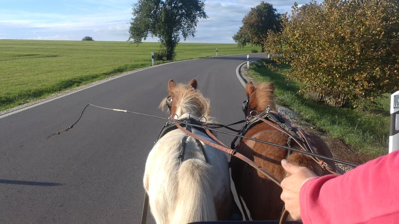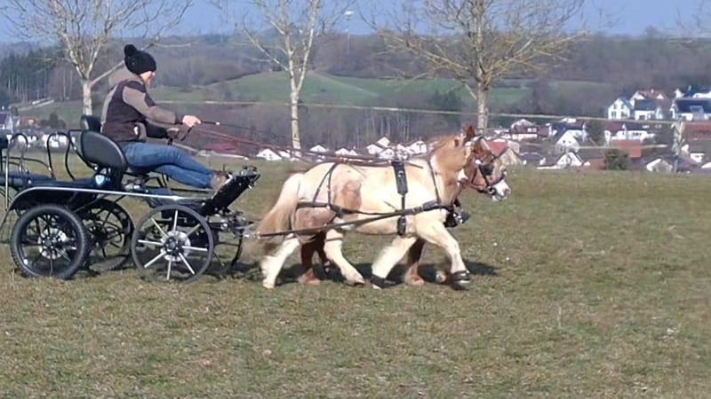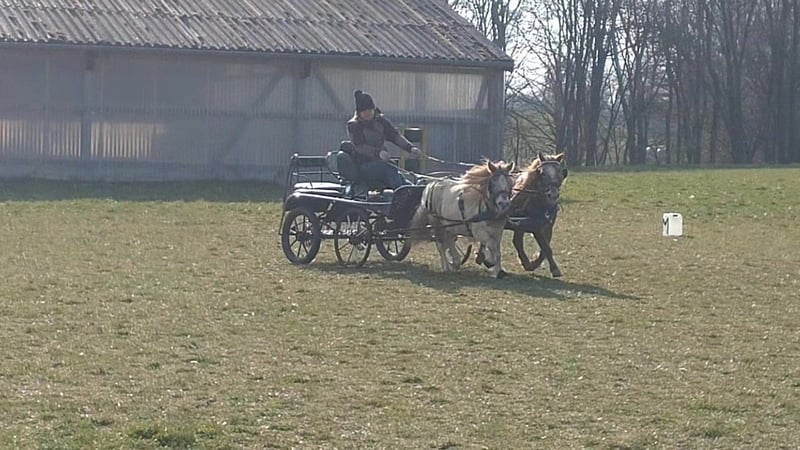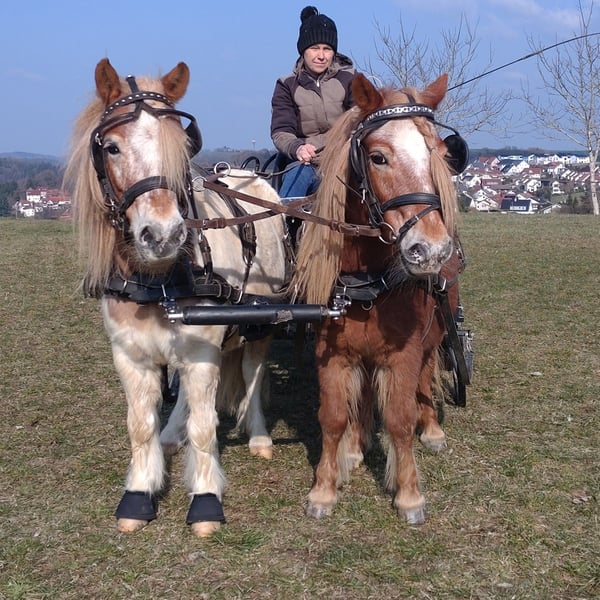 Wir verkaufen unser gut aufeinander abgestimmtes Passgespann. Markus, 7 Jahre alt, ca. 95 cm groß, Wallach Vosje, 12 Jahre alt, ca. 96 cm groß, Stute, bei ihr wurden letztes Jahr die Zähne gerichtet. Beide sind regelmäßig entwurmt und geimpft Herdenverträglich, stehen im Moment in einer gemischten Herden. Im täglichen Umgang überzeugen Sie durch ihr unkompliziertes Wesen. Sie sind schmiede- und verladefromm. Sie zeigen sich zuverlässig und nervenstark im Straßenverkehr. Die beiden wurden letztes Jahr im Sommer schonend eingefahren und befinden sich jetzt im Vorbereitungstraining auf das Fahrturnier in Heuchlingen am 12.04.2026 (WBO). Beide haben einen Equidenpass ohne Abstammung. Der angegebene Preis gilt für beide Ponys zusammen ohne Zubehör. Bei Interesse bitte unter folgenden Nummer anrufen 0157/72159621, es können auch gerne Videos versendet werden.