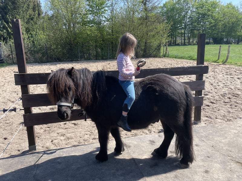 Wir verkaufen schweren Herzens unseren Murmel. Wir haben ihn im Sommer 2022 direkt vom Züchter gekauft. Er lebt bei uns im Offenstall mit drei weiteren kleinen Ponys. Wenn es ums Futter geht ist er hier der Erste. Er ist dabei aber nicht aggressiv und teilt auch. Er spielt sehr gerne und braucht um glücklich und ausgelassen leben zu können auch in Zukunft jemanden zum Spielen. Er wurde bis vor drei Jahren auch regelmäßig ein- und zweispännig gefahren. Murmel ist den Umgang mit Kindern gewöhnt und dabei sehr lieb. Auch ein Laufstall mit Baby am Stall ist ihm nicht fremd. Er kennt Reitunterricht mit und ohne Longe. Die Kinder springen mit ihm auch. Er kennt Spaziergänge mit Kinderwagen und Hund über die Autobahnbrücke und am Flughafen und hat keine Probleme mit Begegnungen mit Hunden oder Kühen. Er macht auf dem Reitplatz alles mit wie Reiter mit Regenschirm, Gymnastikbälle schießen, über Folien laufen und lässt sich auch "verkleiden". Beim Reiten und im Umgang hat er trotzdem seinen eigenen Kopf - er ist eben ein echtes Shetty. Man muss sich schon durchsetzen können bzw. die Kinder begleiten. Er ist neugierig und kommt auch gerne kuscheln. Außerdem hat er Erfahrung im natural horsemanship, in der Handarbeit und auch mit der Doppellonge. Gegen einen Aufpreis kann auch sein Zubehör dazu erworben werden (Schrank, Sattel, Trense, Abschwitzdecke, Kapzaum...) Bei Interesse und für weitere Informationen freuen wir uns auf Ihre Kontaktaufnahme. Für eine Kennlernstunde mit Probereiten nehmen wir 30€ die natürlich beim Kauf verrechnet werden.