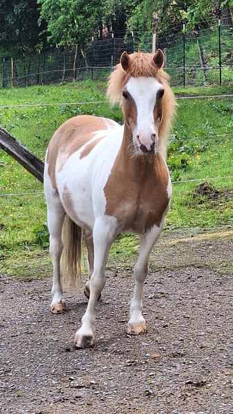 Hübsche 11 j. Irish Skewbold Pony Stute im sportlichen Shetland Typ stehend. 112 cm groß. Fuchsfalb Schecke. Darcys Reggie Lady, genannt Gipsy wurde 2021 aus Irland importiert und bei dem Vorbesitzer einspännig vor der Kutsche gefahren und von einem älteren Mädchen geritten und ein jüngeres Kind auf ihr geführt. Trotzdem sehe ich Gipsy nicht als reines Kinderpony, da sie im Umgang sensibel und bei Kindern zickig beim Hufe geben ist. (bei routinierten Erwachsenen geht das problemlos). Beim selbständigen Reiten testet sie auch schon mal. Bodenarbeit und an der Longe laufen kennt Gipsy, sie hat Freude an Beschäftigung. Bei mir war sie in den letzten 2 Jahren nur Beisteller, von gelegentlichen Spaziergängen abgesehen. Sie geht bei Spaziergängen am losen Strick ohne zu ziehen und steht auch geduldigt wenn man anhält. Ideal als Beisteller, da sie gut alleine bleibt, im Stall wie auf der Wiese und E-Zaun sicher ist. Lässt sich problemlos auf der Wiese fangen, kommt meist sogar von selber an. Gipsy kennt Kühe, Esel und umherlaufende Hunde. Gipsy lässt sich gut verladen und fährt auch alleine im Hänger. Bei mir ist sie tagsüber auf der Wiese, nachts in der Box mit Heu und Mineralfutter. Sie kennt aber auch Offenstall Haltung, das hatte sie bis Herbst. Da wir im Wolfsgebiet leben, haben wir die Pferde nachts in Boxen. Da sich Gipsy im Offenstall wohler fühlt, gerne im Offenstall oder Laufstall abzugeben. In der Herde (gemischte Herde wie Stuten Gruppe) verträglich, geht Streit aus dem Weg. Gipsy ist Ekzemfrei, 3x jährlich entwurmt, geimpft (Tetanus, Influenza, Herpes). 11/25 die Zähne gemacht, keine Zahn Erkrankung vorhanden. Gipsy geht barfuß und hat regelmäßige Hufpflege durch den Hufschmied, zuletzt 11/25. Zubehör habe ich außer ihrer Trense keins. Die Trense gebe ich gerne dem neuen Besitzer. Ich wünsche mir für Gipsy Menschen, die Zeit und Lust haben, sich mit einem Pony zu beschäftigen, egal ob nur putzen oder mehr, denn wenn sie ihre Menschen kennt ist sie ein vertrauensvolles Pony, was auch gerne kuschelt. Standort: NRW. 58540 Meinerzhagen
