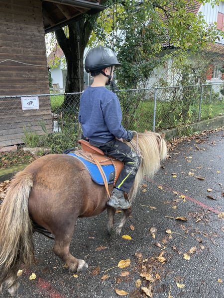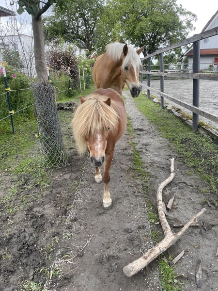 Bonnie ist ein super-tolles Pony mit vollen Papieren, mit dem man viel Spaß haben kann. Sie ist definitiv keine Schlaftablette, hat viel Go und liebt es, Neues zu lernen. Am liebsten geht sie mit Fahrradfahren oder ist als Handpony bei jedem Abenteuer dabei. Freispringen und Springen an der Hand ist ihre Leidenschaft, wir sagen immer, sie springt so hoch, dass man ihren Bauchnabel sehen kann. Berge (und Hügel) mag sie auch, ihr Lieblingsspiel ist es, bei uns dem Damm hoch und runter zu galoppieren. Sie wurde von einem Profi eingefahren, zweispännig macht sie das sehr gut. Einspännig hat sie noch viel Angst, das müsste definitiv geübt und gefestigt werden. Als Kinderpony ist sie nur bedingt geeignet. Kinder können sie führen und auch frei reiten, sowohl auf dem Platz als auch im Gelände, allerdings NUR, wenn eine Vertrauensperson dabei ist. Viele Kinder auf einmal mag sie nicht so gerne. Trotzdem war sie bei mir auch bei Reitpädagogik-Einheiten dabei. Es gilt wieder: Mit einer Vertrauensperson dabei ist vieles möglich. Hänger fahren ist kein Problem, das machen wir recht häufig, um an anderen Orten spazieren zu gehen. Schmiedefromm würde ich jetzt gerne schreiben, ist aber nicht 100 Prozent so. Da kommt wieder das Vertrauen ins Spiel, sie braucht oft ein bis zwei Anläufe, bis sie einen fremden Menschen an ihre Hinterbeine lässt. Wir haben sie aus schlechter Haltung und wollen vermutlich gar nicht wissen, was sie erlebt hat. Es gilt auf jeden Fall Platz vor Preis. Sie wird nicht an Händler, Reitschulen, in Boxenhaltung oder als Beisteller verkauft. Warum gibt jemand so ein tolles Pony her? Wir finden hier leider keine Menschen, die Freude an der Arbeit mit Shettys haben und sie als Pflegepony haben möchte und das Kinderreiten musste ich aus persönlichen Gründen aufhören. Darum ist sie total unterfordert, steht nur rum und frisst und das hat sie nicht verdient. Viel mehr Fotos und Videos gibt es gerne bei ernsthaftem Interesse auf Anfrage.