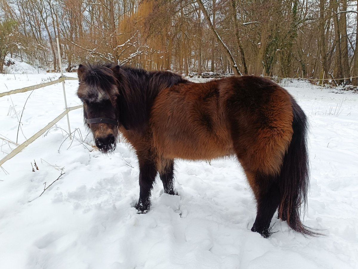 Shetty Stute über 20 Jahre mit schönen Bewegungen. Auf dem rechten Auge blind, was sie kaum behindert. Sonst fit und unkompliziert. Bisher ohne Rehe trotz Weidegang als Portionsweide. Schlitten gefahren. Trabt neben dem Fahrrad her. Unkompliziert im Umgang. Wegen Tod ihres Partners gegen die o.g. unverhandelbare Schutzgebühr schweren Herzens abzugeben.