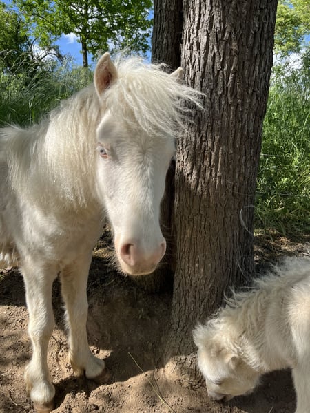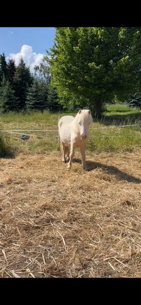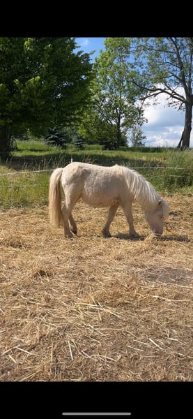 Biete hiermit schweren Herzens meine Cremello Stute, welche am 1.5.24 geboren wurde, zum Verkauf an. Feline wurde letztens erst geimpft (auch gegen das West-Nil-Virus), regelmäßig dem Schmied vorgestellt, sie ist gesund, gechippt, entwurmt und besitzt einen Equidenpass. Endmaß ca. 1-1,05m. Sie hat keine Papiere. Sie ist ein original Shetland Pony. Bei Kostenübernahme kann sie auch gebracht werden.