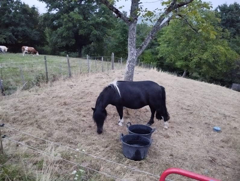 Ponette pleine, papier officiel, geregistreerd bij het Shetland-stamboek als fokdier. Pure bloedlijn van het Shetland-ras - Livre A. Rustig. Kan in alle omstandigheden alleen blijven. Denkt goed na. Zeer sociaal en zoekt contact met mensen. Gemakkelijk te vangen in de wei. Aangenaam in de omgang. Gemoedelijk. Sociaal. Neigt naar dominantie in de kudde. Kan goed overweg met alle paarden, maar ook met honden, kippen, koeien en schapen. Gewend aan tractor, quad, aanhangers, klussen, jagers, wild… Het hele jaar door in de weide, behalve tijdens de strengste winter, om de weilanden te beschermen tegen betreding. Alles is mogelijk: fokproject of sport en competitie. Ideaal als fokkerdier of eerste pony voor een kind. Heeft nooit in een club gereden. Maar is wel aangezadeld en geschoeid, en heeft ooit een kind op de rug gedragen zonder problemen. Voor het eerst gedekt in 2024 – dracht zonder complicaties. Rustige veulen, stevig gebouwd, net als haar moeder, verkocht als fokprospect. Leert haar veulen verzorgen en verbindt hem met anderen en met mensen. Makkelijk veulen. Niet herzadeld, verkocht als merries, zonder dracht. Een zeldzaam product op de markt. Haar vader is de internationale klasse 1 hengst TEXAS DU LUTZELHOF (laatste foto - tobiano schimmel).