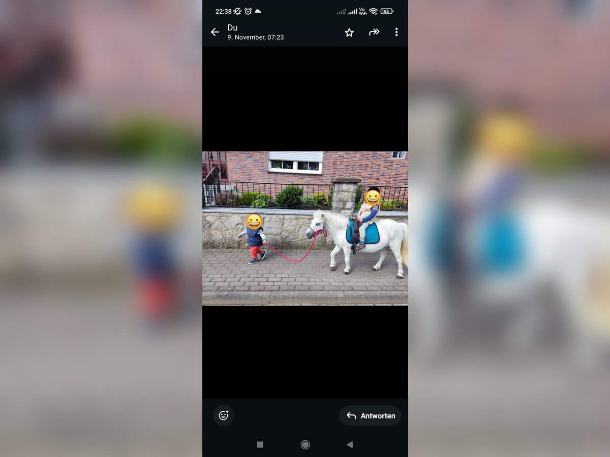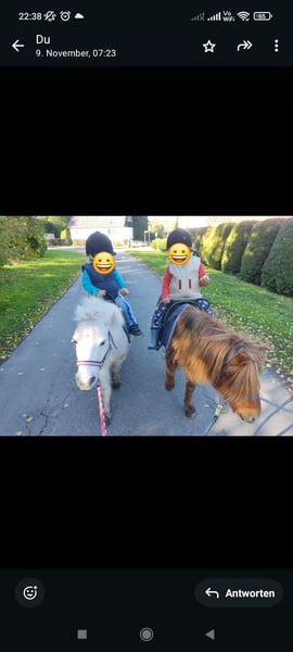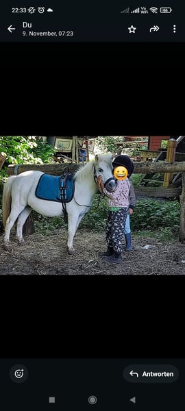 Polly ist eine kleine, typisch Pony, theoretisch weiße, ca. 17j. alte Ponystute mit einer Größe von ca. 95cm. Sie gebe ich nur in die besten Hände ab, da wo es einfach passt. Am liebsten würde ich sie nur zusammen mit Floh weggeben, da die beiden sich sehr gut verstehen.Es ist kein Notverkauf! Ich gebe sie nur ab, da meine Kinder zu schwer für sie geworden sind und sie jetzt doch überwiegend herumsteht. Polly ist ein typisches Pony, was man gerne haben muss. Manchmal etwas zickig und launisch, liebt aber Spaziergänge, geht an der einfachen longe sowie an der doppellonge, kennt langzügel, Schleppe und Schlitten ziehen, während sie dabei geführt wird. Eigentlich wollte ich sie einfahren, aber das wollte ich jetzt die ganzen 4 Jahre und habe es zeitlich nicht geschafft, sodass ich realistisch glaube dass ich es auch nicht mehr schaffen werde. Aber ich kann sie mir sehr gut vor der Kutsche vorstellen. Als Kinderpony ist sie super! Lässt sich führen, putzen bemalen und auch geführt reiten. Sie ist überwiegend entspannt (außer bei Trecker). Alles weitere bei Interesse.