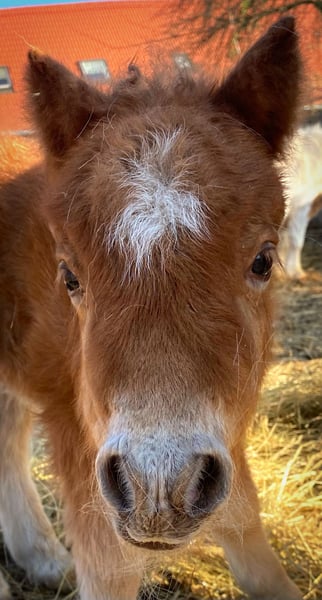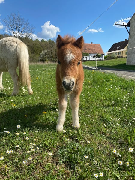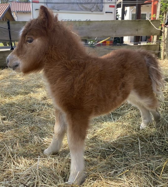 A beautiful, robust, self-bred mare from our family breeding program. Halter-trained, handleable by children, hoof trimming with a rasp possible, traffic-safe, familiar with dogs, cats, mice – all everyday sounds – never ill, no eczema, no laminitis. She is currently in our foal-rearing herd, living in a small mixed group in an open stable. Pandora has a calm, friendly temperament – she easily follows others and always behaves thoughtfully and very well-behaved. She has a strong, solid foundation and would certainly make a good broodmare. The second-to-last picture shows her mother, Many Minis Panama – a state premium mare. The last picture features her sire, Fleetwood Ley Piano – a South German premium stallion. More pictures and videos are available upon request or at: www.km-minishetlands.de https://www.facebook.com/kmstallions.de/