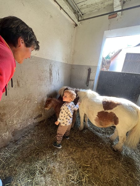 For sale is a charming Mini Shetland pony mare, born on May 12, 2025. She is a beautiful bay roan with a height of 80 cm and is perfect for leisure activities. This delightful pony is friendly, curious, and has a gentle character, making her an ideal companion for children and beginners. She loves being outdoors and enjoys playing and frolicking. The pony is well-socialized and has already gained some experience in interacting with people. She is healthy and fit, ready for new adventures and a loving family. If you are looking for a loyal friend or simply a pony to cuddle with, then this Mini Shetland pony is just right for you! Chrissy has 3 siblings who are very child-friendly. 2 are with the same family and are currently being trained to drive; they can perform tricks and are simply fun to be with. If you are interested or have any further questions, please feel free to contact us. We look forward to your message!