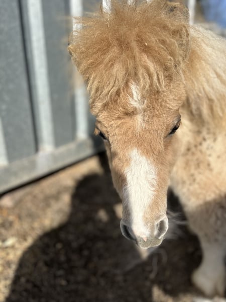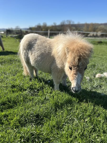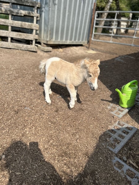 Puledro di mini Shetland, stallone, nato da svezzamento, castrone, colorato, con mantello roano e sf