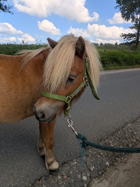 "Kalle" Kalimero from Radebachtal is an alert, curious, and yet relaxed little stallion who is now looking for a new 5-star home. At his age, he is playful and loves to romp around the pasture with his buddies (another Mini Shetland stallion and a Quarter yearling). However, he also enjoys some alone time and sometimes stands apart from the herd; he is not clingy. He is used to being in a herd with larger horses as well as other young stallions. In terms of character, he is a loving and cuddly little guy who has integrated well into the herd. His behavior in the herd is absolutely uncomplicated, and he is always friendly towards humans and easy to handle. He has grown up with peers of the same age, Mini Shetlands, and is accustomed to living in an open stable environment, 24/7 year-round. Currently, he is still on a large, rather sparse pasture 24/7 in the summer; in his new home, the grazing time should preferably be rationed or limited for health reasons, e.g., replaced by paddock housing with sufficient hay and/or dry haylage feeding. Due to his good lineage (more detailed information can be provided upon serious interest), I could also see him being presented at a breeding inspection. Otherwise, he will certainly be enthusiastic about work in front of the sulky and, of course, groundwork at the appropriate time, as he has an intelligent nature. Even though he is a small, uncomplicated Shetland pony, he is still a stallion that belongs in experienced and consistent hands. He should not be in the sole care of children. He currently shows no stallion behavior, but this can change quickly with the first contact with mares (even the scent of mares in heat from several hundred meters away can be detected by stallions). The new owner is, of course, free to have him gelded; the sooner, the better. He is NOT suitable for riding by small children!!! This is not an urgent sale!!! As I am very concerned about his future home, he will only be sold under the following conditions: - He will only be placed in a 24/7 year-round open stable environment; box housing would certainly harm his health due to his massive, thick, and dense coat. - He will only be placed in a herd that also includes other Mini Shetlands or at least Shetlands, as this is required from an animal welfare perspective. He needs to be able to play with buddies of his size and exchange social behaviors such as grooming. - He will NOT be sold to riding schools or horse dealers. - He will not be sold as a riding pony; he is not suitable for that and it would harm his health. - He will be sold with a buy-back option. - He will NOT be sold as a "lawnmower." He is regularly presented to the farrier, is regularly dewormed, and finds the horse trailer extremely exciting. I would wish for him a home enthusiastic about Mini Shetlands, e.g., lovers of this breed or truly and seriously ambitious experienced pony people. Serious inquiries can visit the little man, and as always, placement takes precedence over price. If interested, please leave your name and phone number, and I will call back as soon as possible!