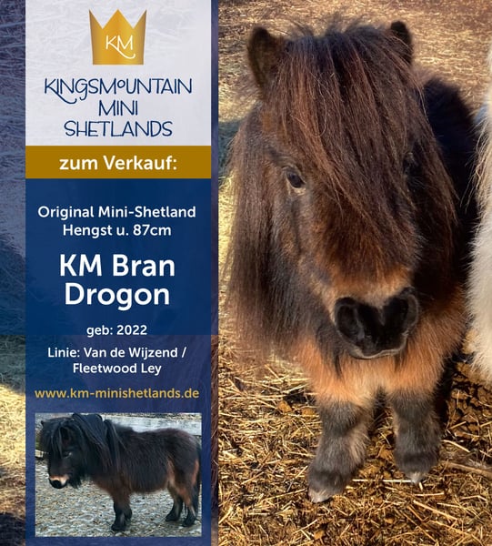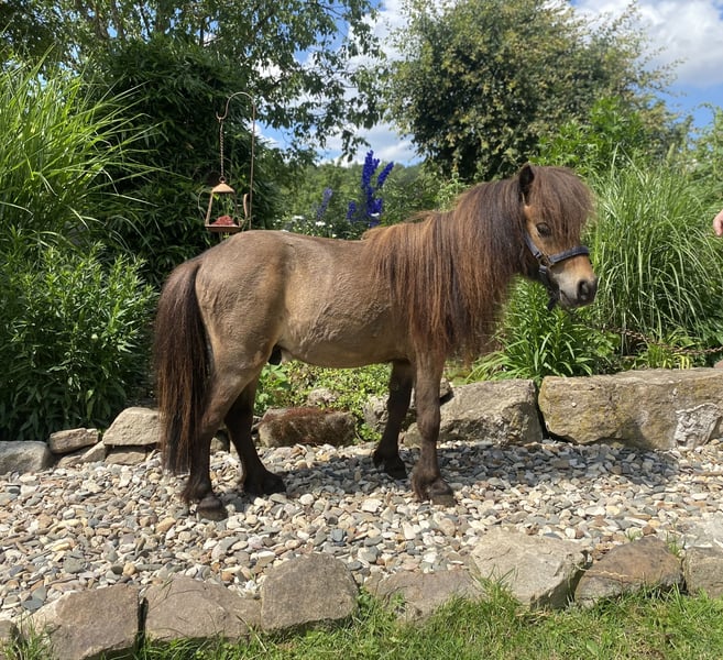 A beautiful home-bred stallion from our family breeding. Can be haltered, can be handled by children, hoof trimming with Flex possible, roadworthy, knows dogs, cats and mice - everyday noises - never ill - no eczema, no laminitis - stands with us in a small mixed herd in an open stable. A stallion with beautiful thick hair - remains small - very interesting for breeding. More pictures and videos on request or at: www.km-minishetlands.de https://www.facebook.com/kmstallions.de/