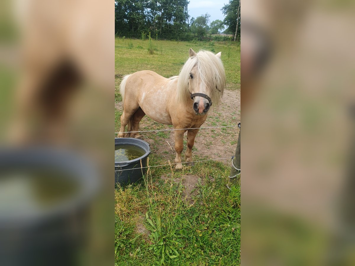 Schöner goldfarbener Shetland-Hengst mit Bles. Im Besitz eines Passes und lebenslang zugelassen beim NMPRS. Vater: Highlight vom Ellernbrook Mutter: Amber van Stal De Hestert Vaters der Mutter: Kerswell Cloud