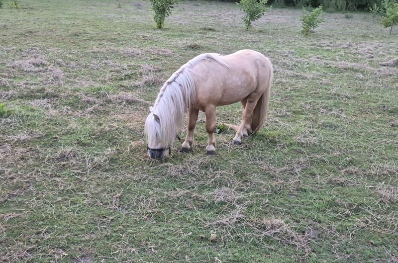 Bellissimo puledro Shetland Pony palomino dal colore dorato con una macchia bianca sulla fronte.