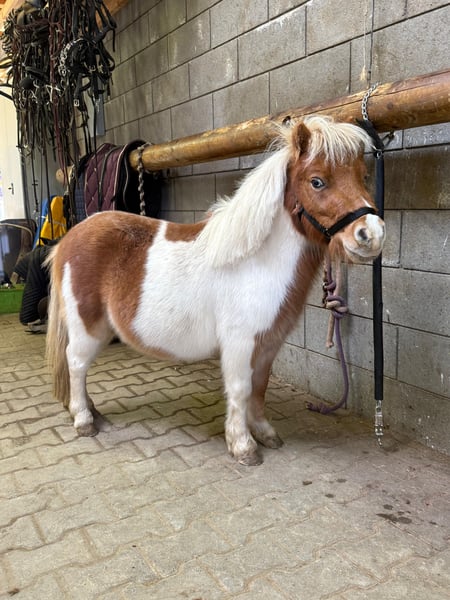 À vendre : un jeune étalon Shetland de deux ans, né au printemps, avec une apparence superbe et sans pedigree. Il mesure actuellement environ 81 cm au garrot. Il possède de beaux yeux bleus et une magnifique robe pie. Il vit en groupe avec un autre étalon et est également compatible avec des hongres. Il est docile lors du pansage, du nettoyage des pieds et à l’attache. Il est halter-trainé et calme en manipulation. Ce serait sûrement un excellent poney pour enfants. Deux autres étalons pie sont également disponibles à la vente. Aucune maladie ou allergie connue. Un contrôle vétérinaire (AKU) peut être effectué sur demande. N'hésitez pas à appeler ou à envoyer un message au 0157 36803742. Toutes les informations sont données sans garantie, prix susceptibles de changer, transport possible, achat en ligne possible.
