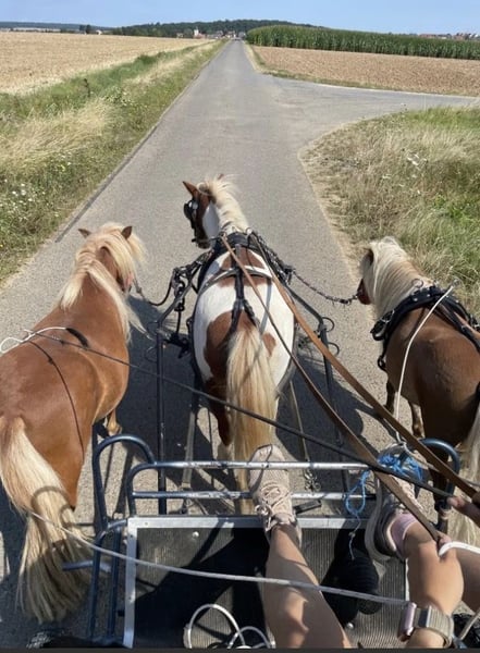 Zum Verkauf stehen zwei liebe Shetty-Jungs (werden im Mai 4 und 5 Jahre alt) mit einem Stockmaß von ca. 90 cm. Beide besitzen einen grünen Pass und wurden bereits erfolgreich vor der Kutsche eingesetzt. Trotz ihres jungen Alters haben sie schon WBO-Turniererfahrung gesammelt und sich dabei absolut brav, gelassen und ohne Aufregung gezeigt – auch beim ersten Turnier. Sie sind in den Disziplinen Kegelfahren, Hindernisfahren und Geländefahren gestartet. Die beiden sind ein eingespieltes Gespann und wurden sowohl einspännig als auch zweispännig sowie im Tandem gefahren. Auch das Schlittenfahren macht sehr viel Spaß. Neue Situationen meistern sie stets ruhig und souverän. Im Umgang sind sie sehr freundlich und unkompliziert, auch Kinder können problemlos mit ihnen umgehen. Sie eignen sich hervorragend als Handpferde, auch mit Stuten. Beide zeigen kaum Hengstmanieren. Im Gelände sind sie sicher unterwegs – auch einspännig kein Problem. Beim Hufschmied sind sie brav. Durch ihr ruhiges Wesen und ihre Nervenstärke sind sie ideal für Anfänger geeignet. Man kann die zwei auch ohne Probleme überall alleine einspannen. Sie bleiben ruhig und geduldig stehen. **Kurz zusammengefasst:** * 4 & 5 Jahre alt (im Mai) * Shetty-Hengste, ca. 90 cm Stockmaß * Grüner Pass * WBO-Turniererfahrung (Kegel-, Hindernis- & Geländefahren) * Einspännig, zweispännig & Tandem gefahren * Schlittenfahren problemlos * Sehr brav, gelassen und nervenstark (auch bei neuen Situationen) * Kinderlieb & unkompliziert im Umgang * Gute Handpferde, auch mit Stuten * Kaum Hengstmanieren * Gelände sicher * Problemlos beim Hufschmied * Anfängergeeignet * keine Rehe oder Ähnliches * sind E-Zaun sicher Verkauf ausschließlich als Gespann. Preis für beide. Bei Interesse oder für weitere Informationen gerne melden.