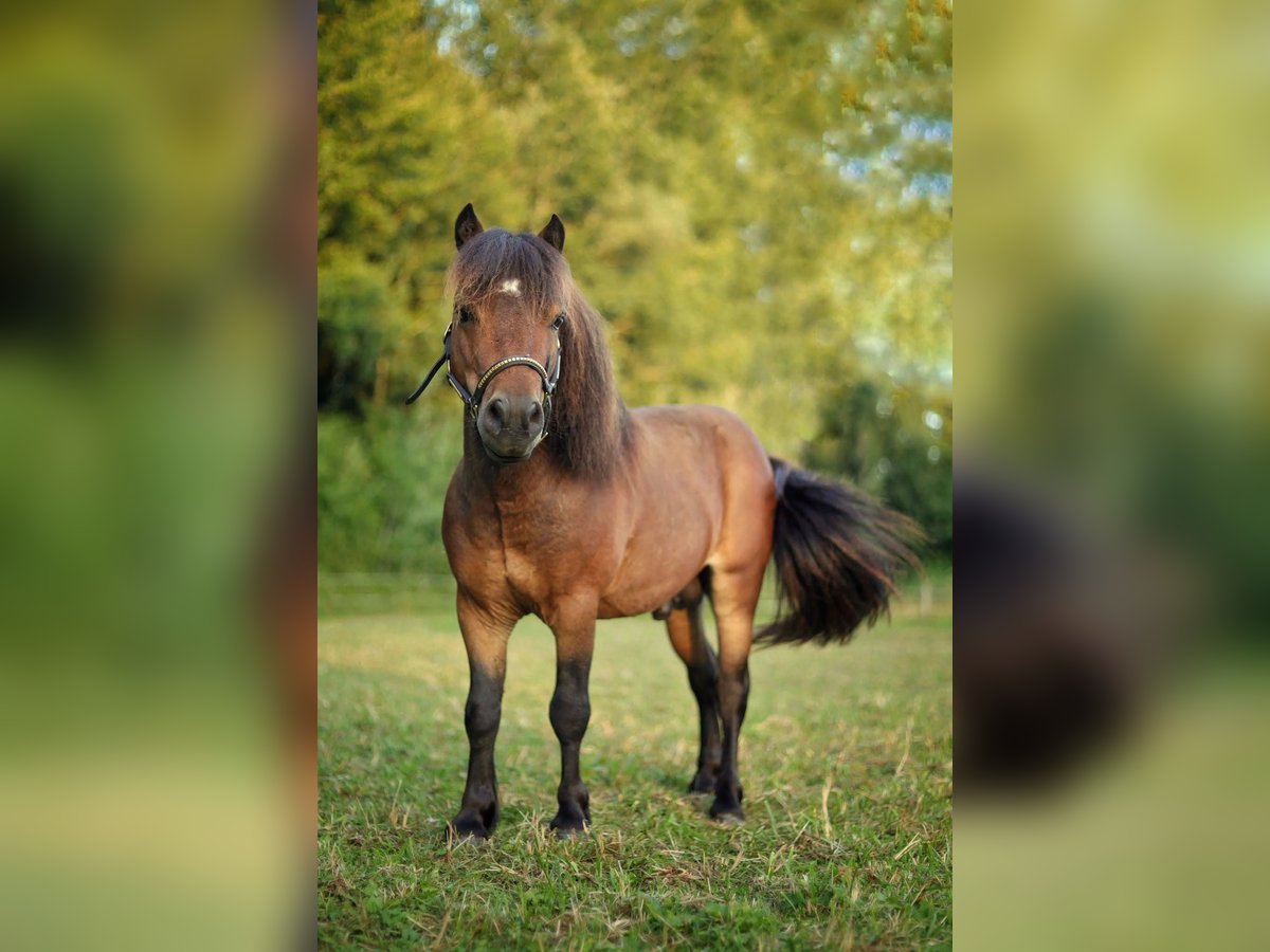 Étalon de 2020 Pp shetland livre A Bai de taille intermédiaire Produit de bons poulains, vit en troupeau très gentil et respectueux Debourré monté et attelage