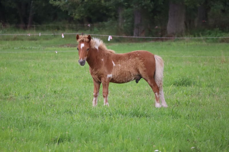 Unsere Shettyfohlen suchen ab Herbst ein neues Zuhause. Unsere Fohlen wachsen bestens sozialisiert in der Herde auf. Hier laufen sie sicher im E-Zaun. Außerdem sind sie dem Menschen absolut zugewandt. Alle 3 Fohlen sind Original Shetlandponys. Sie stammen vom FN-Leistungshengst Perry ab, der besonders mit seinem tollen Charakter bestach. Perry‘s Sky (Fuchsschecke) Sky wurde am 31.03.2025 bei uns in der Herde geboren. Die Mutterstute ist unsere bildhübsche Fuchsfalbscheckstute Reni. Er wird voraussichtlich ein Endmaß von über einem Meter erreichen. Er ist bereits recht groß. (Bild 1,2,3,4) Perry’s Pedro (Rappe) Pedro wurde am 12.04.2025. Seine Mutter ist unsere Fuchsstute Rebecca, die ihre Leistungsprüfung mit einer tollen 8,51 abschließen konnte. Genauso wie seine Mutter ist Pedro absolut brav und liebt die Zeit mit seinen Menschen. Er ist ein wahrer Kuschelbär. Er ist der Kleinste in der Truppe und wird voraussichtlich ein Stockmaß von 90-95cm erreichen. (Bild 5,6,7) Er wird somit recht günstig abgegeben. Ruth P. (Rappe) Ruth wurde am 04.04.2025 geboren und bestach seit der ersten Sekunde durch ihr starkes Fundament. Ihre Mutter ist unsere Elitestute Rheija vom Purnitzgrund. Ruth hat einen ganz tollen, lieben Charakter und freut sich immer über menschlichen Besuch. Sie wird voraussichtlich ein Stockmaß von 100-103cm erreichen. (Bild 1,5,8,9)