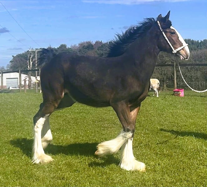 Beautiful perfectly marked yearling filly. Wonderful elegant high action, superb conformation, exceptionally pretty head and lovely head carriage, show quality, good temperament, massive potential in all disciplines. A particularly classy filly. Beautiful limbs. For more information please contact sheila@shiresandclydesdales.com UK and worldwide 01606 883869 0044 1606 883869