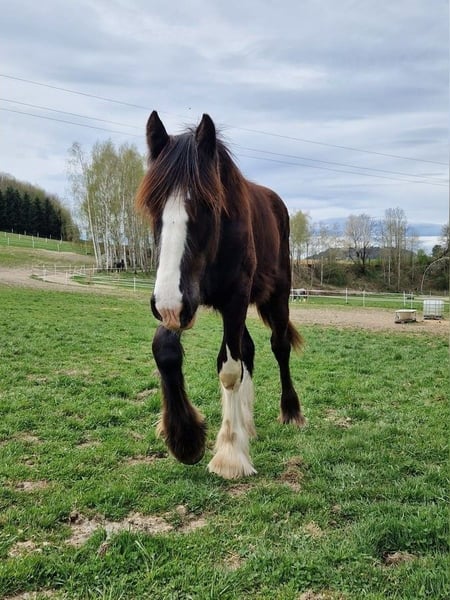 Grazie per l'interesse nel nostro stallone Shire Horse, Fraggle. Shire Horse Fraggle è nato nell'estate del 2024 ed è un bellissimo giovane. Mantiene il colore scuro. La mamma Grace ha un'altezza di 1,85 m, mentre il papà Duke raggiunge i 1,94 m. Pertanto, è probabile che anche Fraggle diventi un rappresentante di taglia maggiore della sua razza. Sfortunatamente, si è sviluppato un gonfiore nelle articolazioni della caviglia di Fraggle, il che ha confermato il sospetto di un chip. Attualmente, Fraggle è privo di zoppia e non ha alcun problema. Dopo aver consultato i nostri veterinari, è stato deciso di non procedere con un intervento chirurgico al momento. Tuttavia, Fraggle è ora offerto a un prezzo inferiore al suo valore a causa di questa situazione - in ogni caso, preferiamo il posto al prezzo. Fraggle proviene dal nostro allevamento e quindi è sotto la nostra cura fin dal primo momento. Fraggle colpisce in particolare per il suo aspetto adorabile. Inizialmente è scettico nei confronti delle nuove persone. Una volta che ha guadagnato fiducia, però, ama le coccole e le sessioni di pulizia. È addestrato a indossare il capestro e conosce tutte le "attività standard" di un puledro (pulizia, cura degli zoccoli, ecc.). Attualmente non è molto entusiasta della cura degli zoccoli, il che dipende un po' dal suo umore del giorno. Abbiamo già completato i primi "viaggi in trailer" con lui, facendogli conoscere senza stress il "mostro trasportatore" come una scatola di cibo mobile. Fraggle è cresciuto insieme ai suoi simili in un branco misto nelle nostre ampie aree di pascolo, il che riteniamo sia particolarmente importante per la salute e l'equilibrio dei nostri cavalli. Attualmente, Fraggle vive con i suoi compagni di gioco in un allevamento di puledri in un sistema di stalla aperta/box con accesso libero. Ci auguriamo per lui una nuova casa con molta compagnia di cavalli. Fraggle è attualmente piuttosto sottomesso e molto facile da gestire con altri cavalli, indipendentemente dall'età dell'altro. Naturalmente, è microchippato, vaccinato e sverminato regolarmente. Chi cerca un bellissimo giovane Shire Horse da accompagnare affettuosamente come partner, può contattarci volentieri. I nostri animali vengono ceduti solo a mani esperte e a una casa adeguata all'età, quindi ci teniamo a prendere il tempo necessario per i potenziali acquirenti. È anche importante per noi che il cavallo partecipi alla decisione - perché anche per i nostri animali deve esserci una buona chimica. Fraggle vive vicino a Bad Füssing - saremo lieti di fornire l'indirizzo esatto al momento della prenotazione. Ulteriori impressioni sui nostri cavalli possono essere trovate anche sul nostro canale WhatsApp. Se interessati, saremo felici di inviare il link. Oltre a Fraggle, offriamo anche altri cavalli in vendita, non esitate a contattarci per ulteriori informazioni. In ogni caso, preferiamo il posto al prezzo. Saremmo quindi molto felici di ricevere una breve descrizione della nuova casa. Non vediamo l'ora di ricevere il vostro messaggio.