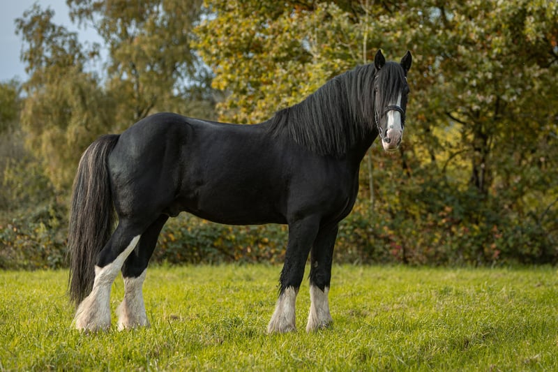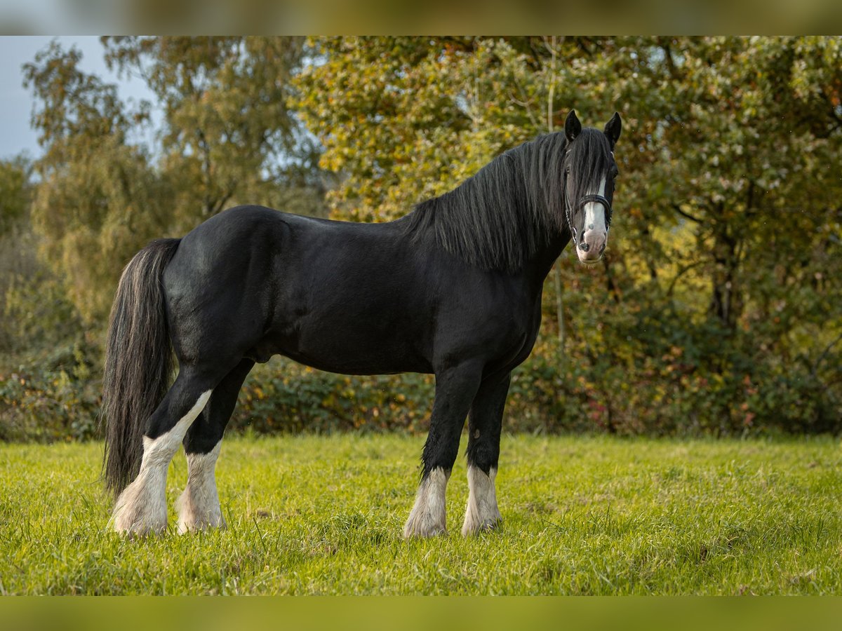 The breeding stallion *Black Diamond Little John* is presented for stud duties. He boasts a striking dark bay coat, four white markings, and no body markings. This handsome stallion stands at 184 cm and features a sporty conformation. He has already successfully covered mares both naturally and by hand, passing on his four white markings, good proportions, and long legs to his progeny. He combines the traditional qualities of a Shire horse—such as pulling ability and gentleness—with the modern demands of the breed, including comfortable and powerful rideability. His solid yet lightly built, athletic exterior is particularly noteworthy, resulting in light-footed movement, agility, and excellent collection and contact under saddle. Character-wise, he is gentle, personable, and friendly, in keeping with the breed’s temperament, and remains calm even in stressful situations. He is also excellent with children. He responds delicately to aids and is highly trainable. He has been trained up to L** level in dressage, is sure-footed in the terrain, and is familiar with circus and liberty exercises as well as lunging work. He is very people-oriented and is frequently used as an animal model for photoshoots, even for non-riders. He has always been kept in group housing, and introductions to new groups have always gone smoothly. He proves to be a confident, attentive herd leader, a caring foster sire, and handles his strength gently and responsibly. As a stallion, he is well-behaved and manageable, respecting his boundaries. He is sure-footed outdoors, load-train, compatible with animals of all types (dogs, cattle, etc.), and has gained experience at events such as the 2017 Baltic Sea Shire Horse Show and as a breed ambassador at the 2018 Equitana Open Air. He is well-socialized, fully vaccinated, and free of health issues. He is neither an Eczema sufferer nor has hoof problems or colic. His joints are solid and durable, and he has never been lame. The most recent comprehensive examination in 2024 revealed no deficiencies. He was licensed in 2020 by the Bavarian Breeding Association for Small Horses and Special Breeds, ensuring his foals receive full registration in Germany. Additionally, in 2024, he was officially recognized as a breeding stallion by the Australian Shire Horse Society. Due to his athletic and refined conformation, he would also be an excellent choice for crossbreeding with warmbloods. Natural cover on-site is possible by prior arrangement, depending on distance. Semen can be shipped Europe-wide via deep-freeze (TG) through the Steinsberg stallion station (link: https://www.hengste-steinsberg.de/black-diamond-little-john/). Further information is available on the website: https://shirehorse-deckhengst.beepworld.de/