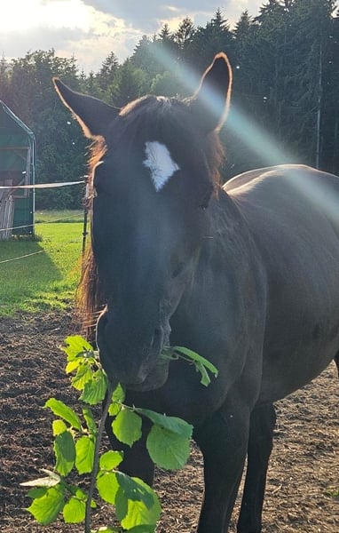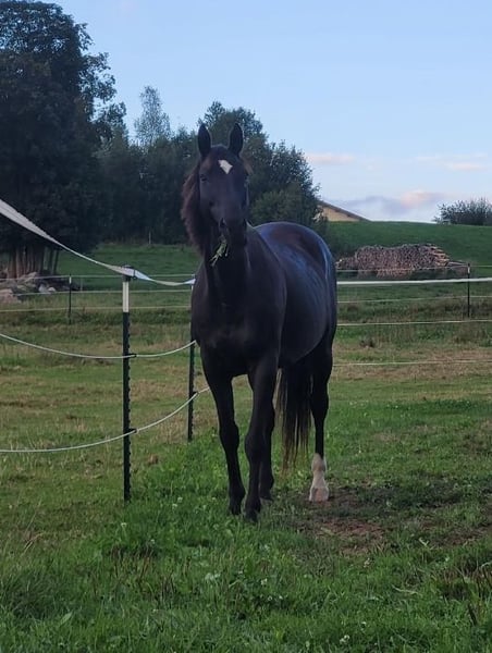 Mein Pferd Romeo sucht ein liebevolles Zuhause. Wunderschöner Farbwechsler Wallach zwischen dunkelbraun und schwarz, ein Slowakisches Warmblut, 13 Jahre alt mit 157 cm Stockmaß. Er ist freundlich und eingeritten, benötigt aber einen erfahrenen Reiter der ihm Sicherheit gibt, weil er schreckhaft auf unerwartetes reagiert. Er mag es aber auch, wenn man nur mit ihm spazieren geht. Romeo läuft barhuf und hat keine bekannten gesundheitlichen Einschränkungen. Er ist brav beim Hufschmied und wird im 10 Wochen Rhythmus ausgeschnitten. Bis 2023 wurde er kalt Beschlagen, danach nicht mehr, weil der Hauptaufenthalt auf der Weide ist, er läuft aber auch auf der Straße oder Feldweg ohne Probleme. Beim Putzen und Satteln bleibt er geduldig stehen. Er wird regelmäßig entwurmt. Er ist seit Mitte 2022 mit Jamie bei uns Zuhause im Offenstall mit dauerhaften Auslauf auf 400 bis 4000m², je nach Wetterbedingungen. Bei uns hatte er auch Kontakt mit einigen Hunden, Katzen, Hühnern und Kühen (letztere auf dem Nachbargrundstück).