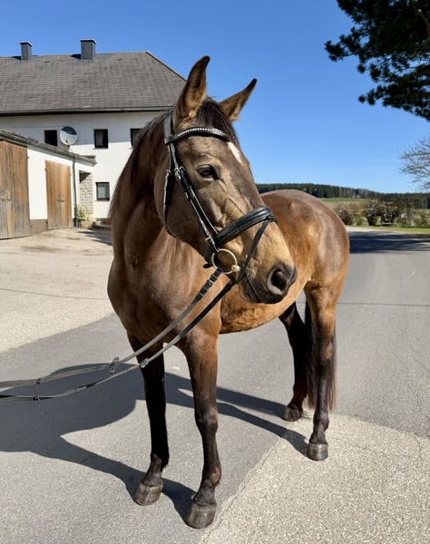 Kasio is an eight-year-old beautiful mare with a special buckskin coat. In summer, her coat shimmers with a golden hue, creating a lovely contrast to her black mane and tail. The 16.1 hh horse is experienced in groundwork as well as riding in the arena or on trails. In handling, Kasio is very calm and relaxed, and she is also quite steady under saddle. She is barefoot, vaccinated, dewormed, and in good health! For more information and videos, please contact me via WhatsApp or by phone at: +43 660 3632373 Location: Pelmberg 15, Upper Austria Viewing and trial riding are available by appointment! Transport of the horse can be arranged if needed.