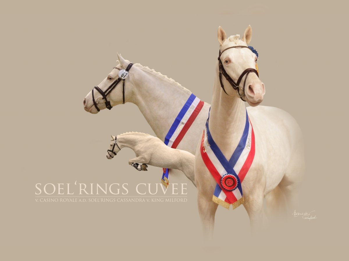 Well presented itself the type full Cremello Stallion with his gaits and proper exterior at the Stallion licensing in 2015 of the Schleswig-Holstein Hamburg e.V. horse Federation and was the race winner sash. He showed impeccable Interior properties on both days and his performances were always marked by great composure when best presence. He impresses with his model and his charisma, beautiful face and beautiful neck formation and good harmony in the entire physique. Söl ´ rings Cuvee completed its 2015 30-day test in Munich riem and convinced in all examination criteria. A performance stallion in the complex context of elegance, with all attributes, a modern "small German riding horse" makes. An above-average interior gives a special touch this stallion in special colour and he knows how to put his harmonious appearance in scene. A special colour for his offspring is genetically highly interesting safe. This special coloring gives such as Palominos, with Brown Mares, buckskin or depending on the mode of inheritance of Palominos and rapping mouse buckskin coupling on a chestnut mare if necessary. A special color is guaranteed. In addition to all other qualities he again and again inspired by his excellent temperament and nature, his balance and friendliness. SÖL 'rings cuvée is the 1st foal of the State premium Mare SÖL' ring Cassandra and was awarded as a foal. His mother "Söl ´ ring Cassandra" finished best of slots with the score 8.48 to 2007 the Mare performance test in Wittensse. In the framework of the elite Mare show of the horse stammbuchs Schleswig-Holstein became race champion Mare. At the Association mares show on the occasion of the Norla in RD, she became the champion Mare. The father of Casino of Royale was champion Stallion of the horse stammbuchs Weser-EMS and 2008 and 2009 National Championship winner of the three - or four-year stallions 2007 and effectively lobbied for this modern made young stallion. In 2009 he received accelerated test in Adelheidsdorf, with a 9.1 - in the rideability of the foreign riders 10.0; in the Parcourspringen, he reached the 9.5; in the trot and in free jumping the 9.0 no single note under 8. This year we offer a Decktaxensplittig: EIE deposit of €250 is payable before the seeds order for payment and the remaining sum of €150 is due after 40 days gestation.