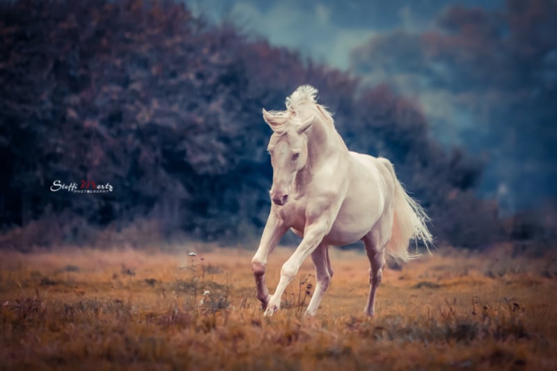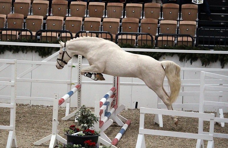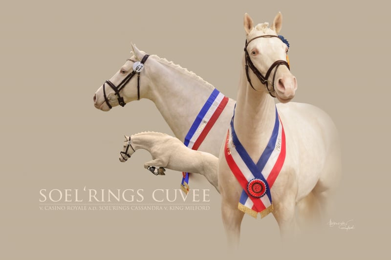 Bestens präsentierte sich der typvolle Cremello-Hengst mit seinen Grundgangarten und korrektem Exterieur bei der Körung 2015 des Pferdestammbuch Schleswig-Holstein Hamburg e.V. und erhielt die Rassesiegerschärpe. Er zeigte über beide Tage tadellose Interieureigenschaften und seine Auftritte waren stets von großer Gelassenheit bei bester Präsenz geprägt. Er besticht durch seinen Typ und seine Ausstrahlung, bildschönes Gesicht und schöne Halsformation, sowie guter Harmonie im gesamten Körperbau. Söl´rings Cuvee absolvierte 2015 seinen 30-Tage Test in München-Riem und überzeugte in allen Prüfungskriterien. Ein Leistungshengst im großen Eleganzrahmen, mit allen Attributen, die ein modernes "Kleines Deutsches Reitpferd" ausmacht. Ein überdurchschnittliches Interieur verleiht diesem Hengst in Sonderfarbe eine ganz besondere Note und gekonnt weiß er sein harmonisches Auftreten in Szene zu setzen. Genetisch hoch interessant ist eine besondere Farbe für seine Nachkommen sicher. Diese besondere Färbung ergibt bei Anpaarung an eine Fuchsstute z.B. Palominos, mit braunen Stuten, Falben oder je nach Erbgang Palominos. Eine besondere Farbe ist also garantiert. Ergebnis Farbgentest Agouti: A/A : Das Pferd hat die Grundfarbe Brauner und trägt kein Allel für schwarz (Rappe). Es kann die Farbe schwarz nicht vererben. Da die Grundfarbe Rappe rezessiv vererbt wird, wird der Nachwuchs unabhängig von der von der Anpaarung nicht die Grundfarbe Rappe haben. Neben allen anderen Qualitäten begeistert er immer wieder durch sein hervorragendes Temperament und Wesen, seine Ausgeglichenheit und Umgänglichkeit. Söl'rings Cuvee ist das 1. Fohlen der Staatsprämienstute Söl'rings Cassandra und wurde als Fohlen prämiert. Seine Mutter "Söl´rings Cassandra" beendete 2007 den Stutenleistungstest in Wittensse als Beste des Lots mit der Wertnote 8,48. Im Rahmen der Elitestutenschau des Pferdestammbuchs Schleswig-Holstein wurde sie Rassesiegerstute. Bei der Verbandstutenschau anlässlich der Norla in RD avancierte sie zur Siegerstute. Der Vater Casino Royal wurde 2007 Siegerhengst des Pferdestammbuchs Weser-Ems und 2008 und 2009 Bundeschampionatssieger der drei- bzw. vierjährigen Hengste und nahm nachhaltig Einfluß auf diesen modern aufgemachten Junghengst. 2009 Kurzprüfung in Adelheidsdorf mit einer 9,1 – In der Rittigkeit erhielt er von den Fremdreitern 10,0; im Parcourspringen erreichte er die 9,5; im Trab und im Freispringen die 9,0 keine einzige Note unter 8. Leistungshengst CA-frei getestet PSSM 2 - frei getestet In diesem Jahr bieten wir ein Decktaxensplittig an: Eie Anzahlung in Höhe von 250,- € sind vor der Samenbestellung zur Zahlung fällig und der Restbetrag von 150,- € ist nach 40 Tagen Trächtigkeit fällig.