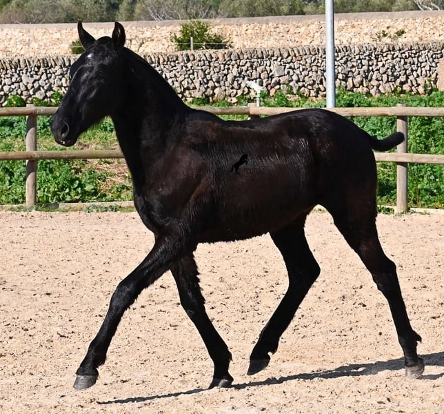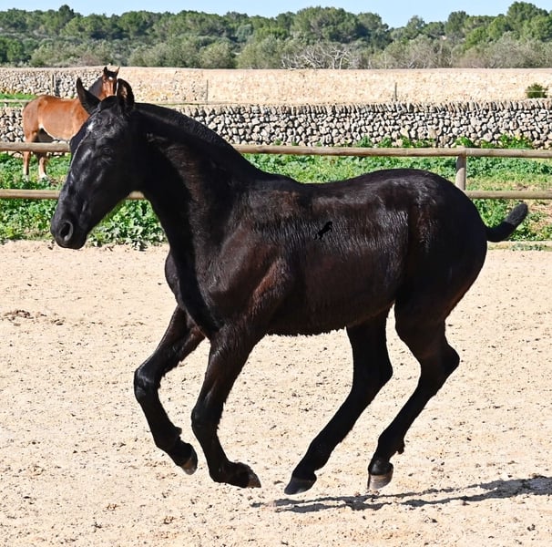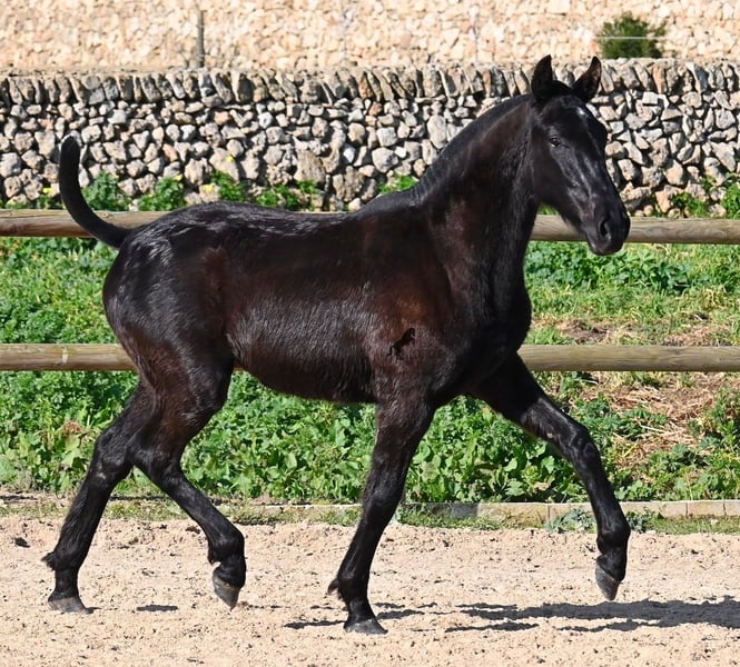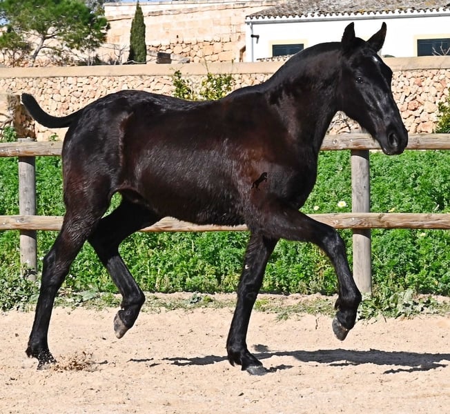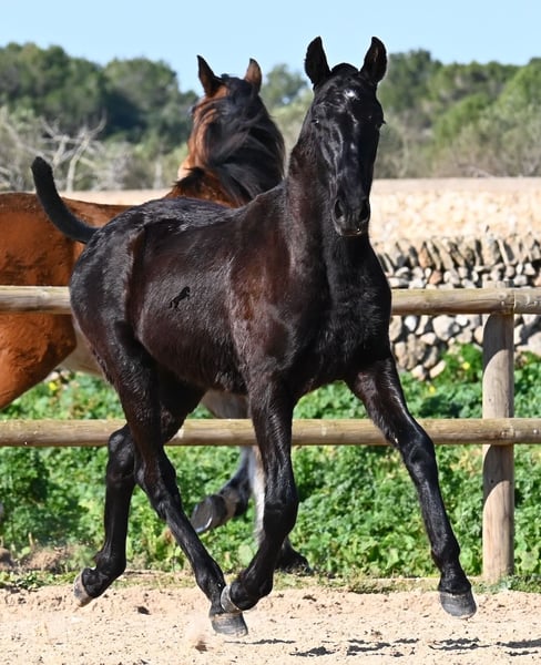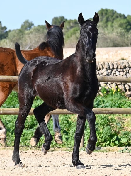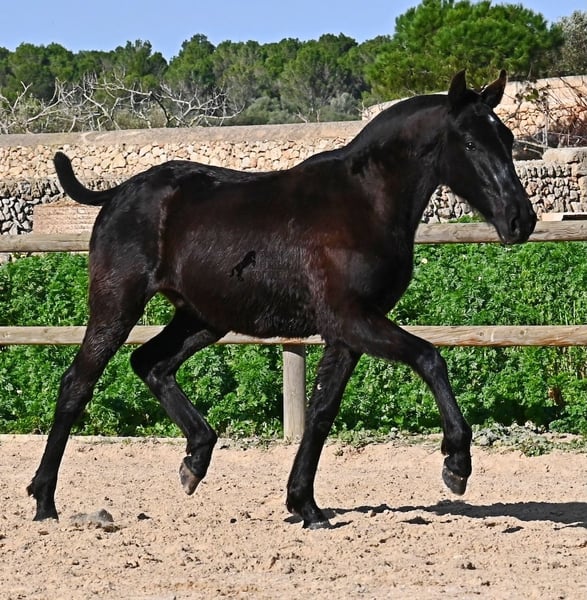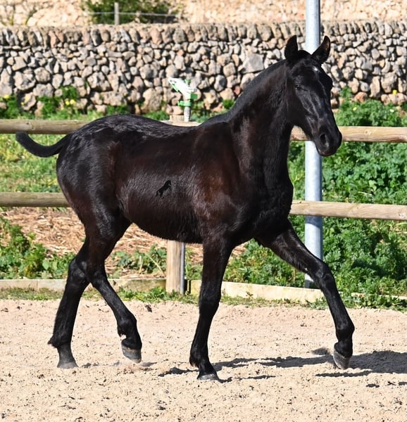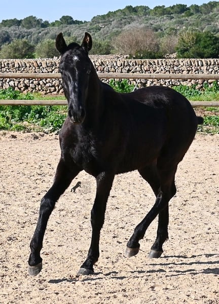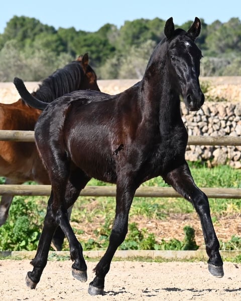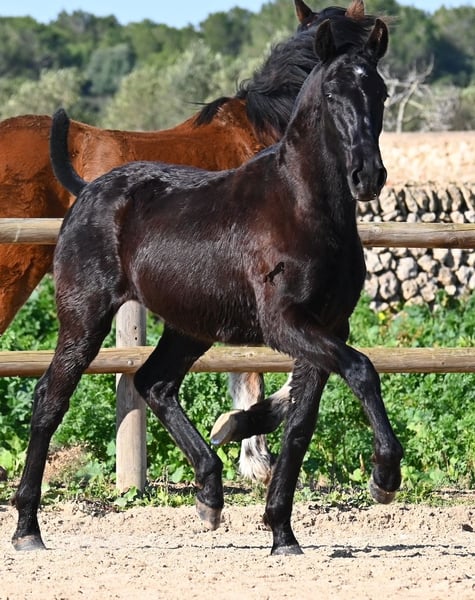 This 01/2025-born, purebred Menorquín stallion is already a very elegant representative of the breed! As is typical for a young horse, his daily routine consists of playing in the herd, growing and thriving ;) He spends 24/7 outdoors on many hectares of land, regardless of the weather, making him a hardy colt with strong legs, a clear mind, and a resilient body. He proudly presents himself for the camera, showing how much energy he has! He is very friendly towards people and has already learned to be handled in his stall, with a solid foal training basic education that can be called upon at any time. His grandfather is a breed champion, and his father measures a proud 170 cm! He may not grow quite that tall, but he will easily surpass the 160 cm mark. Apart from a small star on his forehead, he is completely black. His agility and movement will make him interesting for many disciplines later on, including Working Equitation. For those who wish to acquire him later, there is the possibility of a pre-weaning placement on-site. Videos and pedigree available upon request. His location is Menorca. I am happy to organize a foal health check, transport, or your journey if you wish to come and see him in person. Details can be found on my website or discussed directly. Greetings from Spain