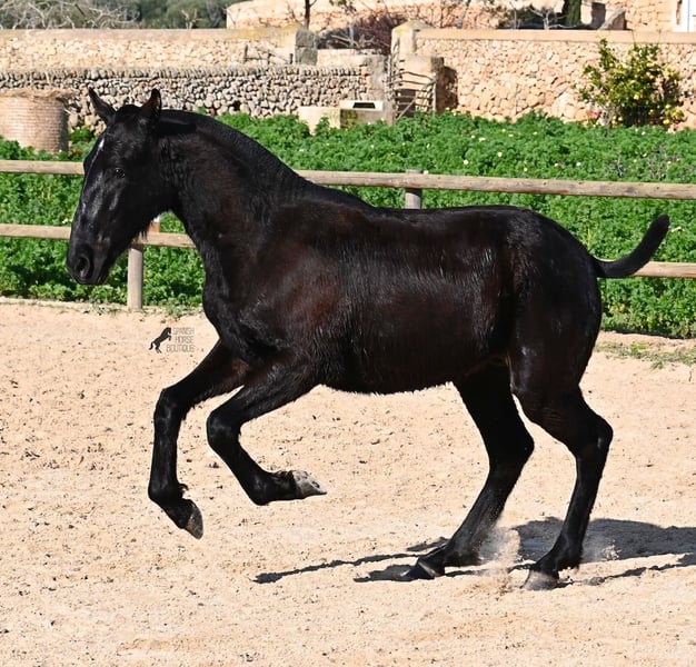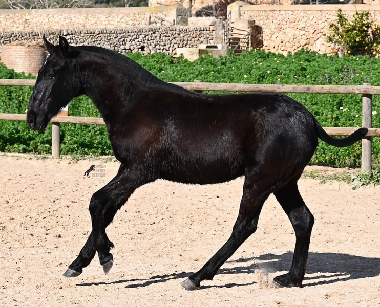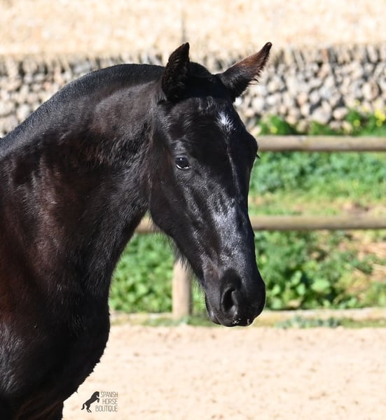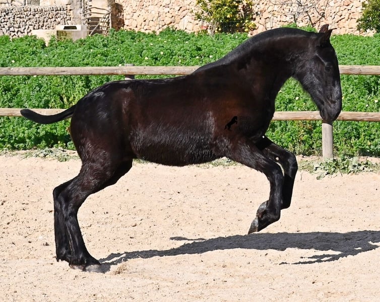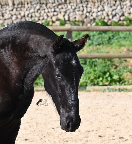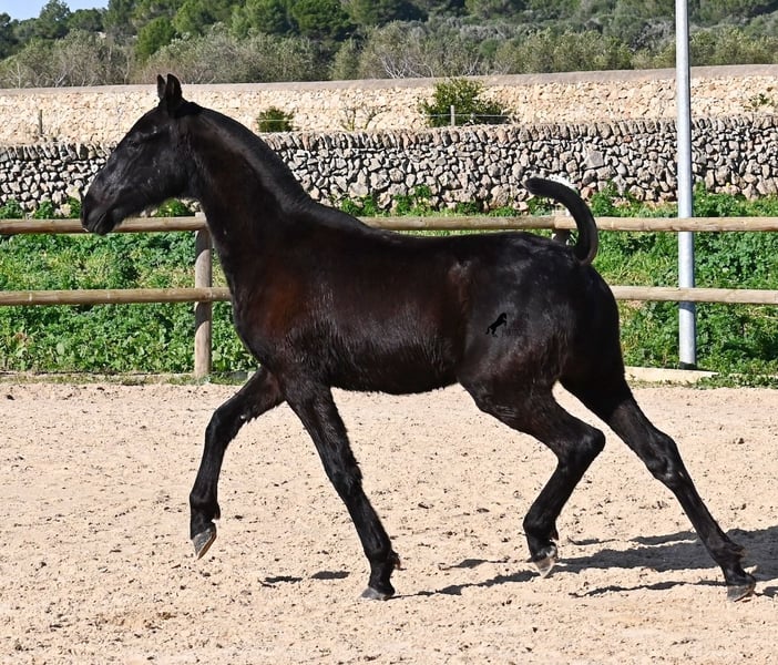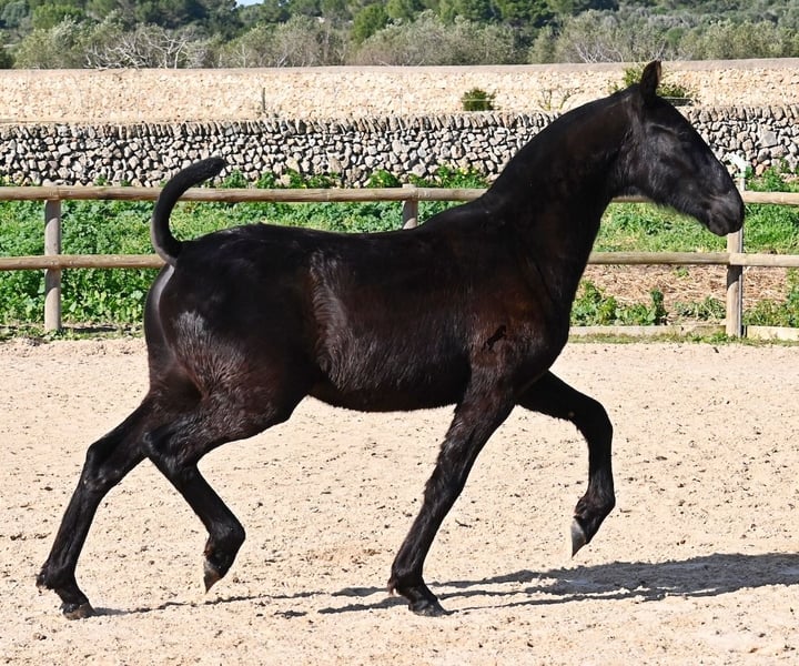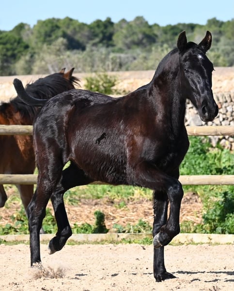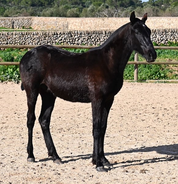 This 01/2025-born, purebred Menorquín stallion is already a very elegant representative of the breed! As is typical for a young horse, his daily routine consists of playing in the herd, growing and thriving ;) He spends 24/7 outdoors on many hectares of land, regardless of the weather, making him a hardy colt with strong legs, a clear mind, and a resilient body. He proudly presents himself for the camera, showing how much energy he has! He is very friendly towards people and has already learned to be handled in his stall, with a solid foal training basic education that can be called upon at any time. His grandfather is a breed champion, and his father measures a proud 170 cm! He may not grow quite that tall, but he will easily surpass the 160 cm mark. Apart from a small star on his forehead, he is completely black. His agility and movement will make him interesting for many disciplines later on, including Working Equitation. For those who wish to acquire him later, there is the possibility of a pre-weaning placement on-site. Videos and pedigree available upon request. His location is Menorca. I am happy to organize a foal health check, transport, or your journey if you wish to come and see him in person. Details can be found on my website or discussed directly. Greetings from Spain