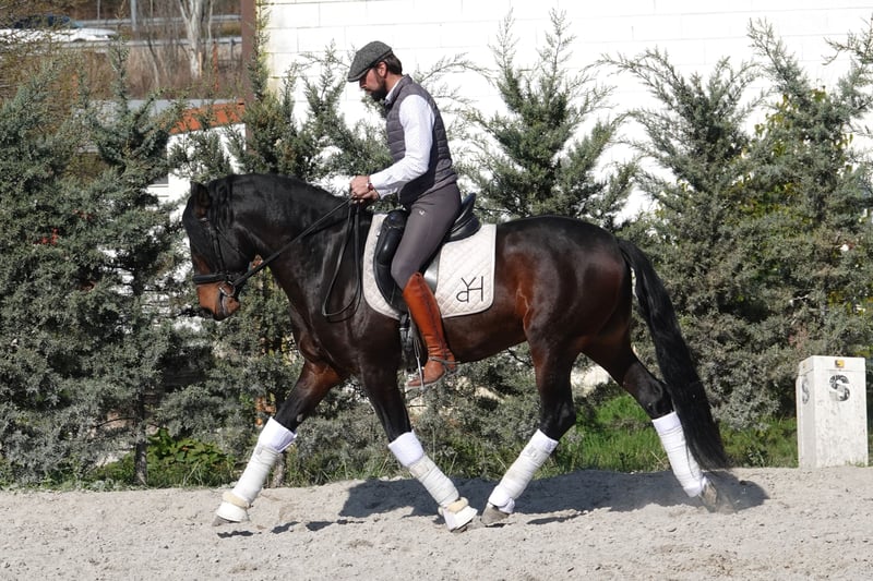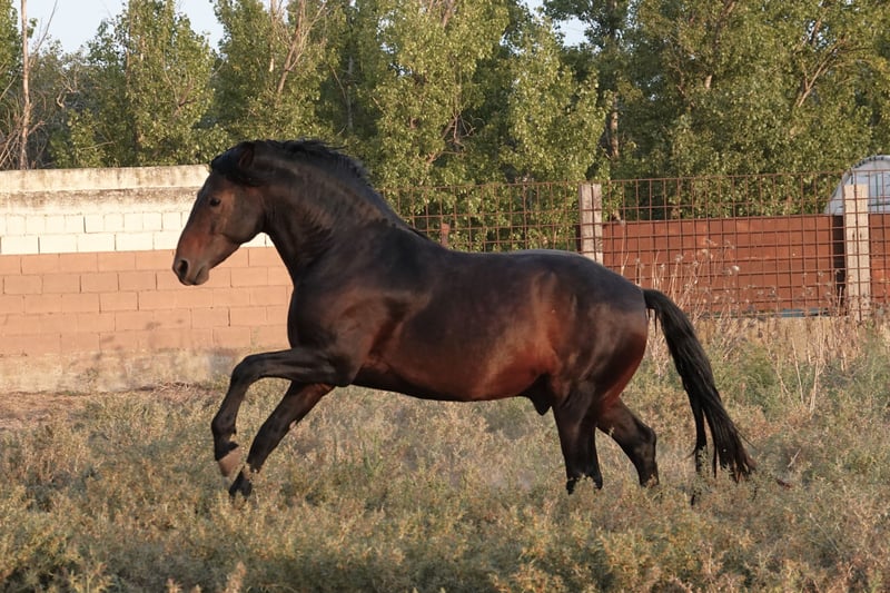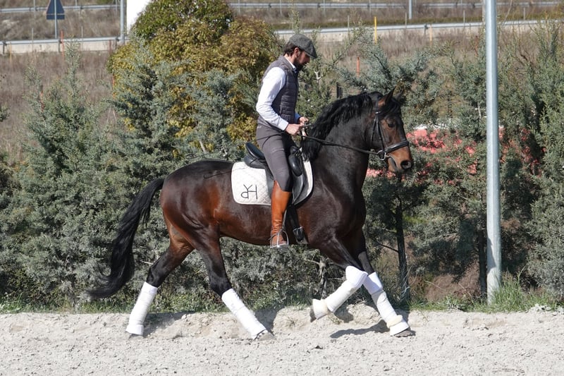 Some horses are easy to describe. Sinfónico is easy to feel. 4 years old. 75% PSLusitano — Alter Real bloodline — and 25% German Warmblood (Donnerhall). Dark bay. Approximately 160 cm. Born and bred in northern Spain. His walk oversteps naturally — that quality is in his blood, not his training. His canter is balanced, powerful, and already shows collection without being asked. On the ground and under saddle he is calm, curious, and genuinely easy — the kind of horse that makes you want to come back the next day. He is four years old. Everything is still ahead of him. The right rider will not just own this horse — they will build something with him, in Dressage or Working Equitation, that could not have been bought ready-made. Piroplasmosis free. Full veterinary records available. Export worldwide. Full profile and video: apmiberianhorses.com