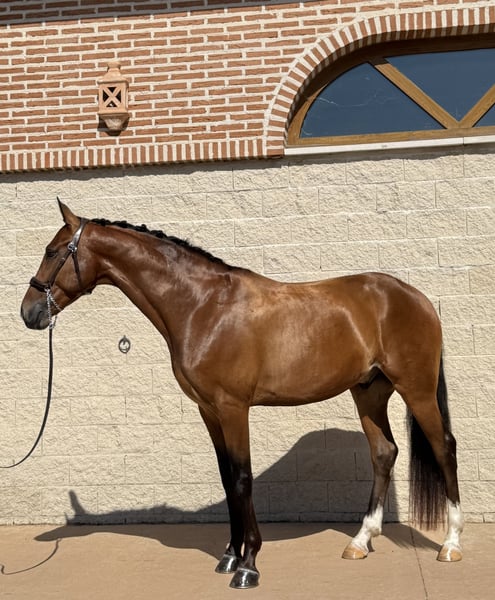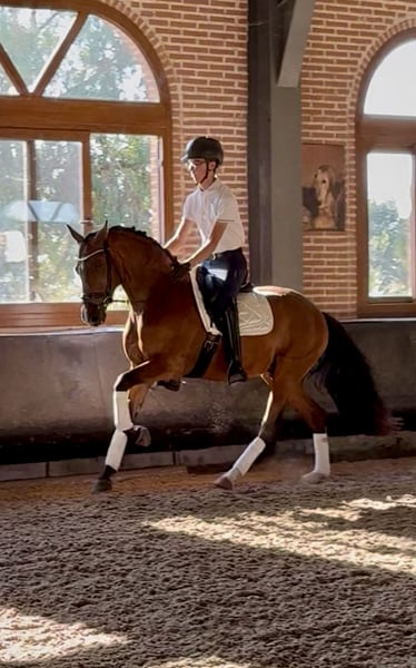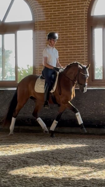 Elegant and sporty gelding, with a very good character and good basic work, perfect for a rider who wants a balanced horse, with the character of a Purebred Spanish horse and the strength and drive of a German mare, son of the Purebred Spanish horse and incredible Poeta de Susaeta (GP horse) and a friendly Oldenburg mare.