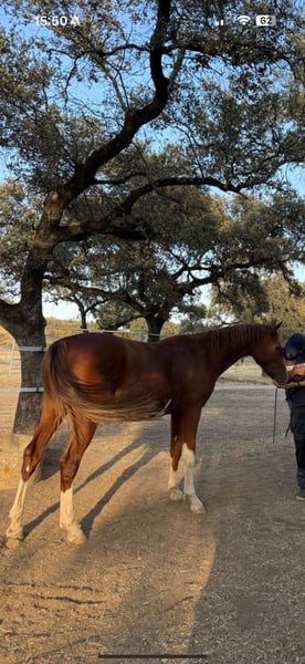Está potra de 2 años y medio nieta de SANTANO, es increíblemente amable y está tratada con cariño y respeto desde que ha nacido. Desde los 9 meses está en mis manos y se deja hacer de todo. He ido a dar paseos al campo del ramal con ella, yo misma le he hecho los cascos y ahora el podólogo puede trabajarla suelta y sin ningún tipo de problema. Amable con el veterinario también. Totalmente limpia y además de preciosa tiene un físico y unos movimientos increíbles. Y un carácter muy dulce. Hay fotos y vídeos desde pequeña hasta ahora. En dos semanas subiré nuevos vídeos y fotos . Si estás interesado escríbeme. Nuestra prioridad es buscarle una buena casa, así que tal vez el precio podamos negociarlo un poco. Es alazana pero puede verse como pinta, por su padre, y ella ha heredado una mancha en la barriga con forma de águila.