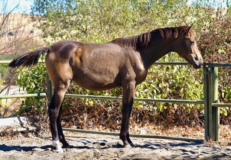 Deze uitzonderlijke bruine merrie is het resultaat van een unieke combinatie tussen een KWPN-merrie van 1,80 m hoogte en een PRE Spaanse Perla-ruin van 1,69 m. Ze onderscheidt zich door haar buitengewone bewegingen en elegante bouw. Met een onberispelijke fysieke structuur beschikt ze over uitstekende africhting en goede hoeven, waardoor ze een ideale keuze is voor zowel dressuur als andere disciplines. Haar genetica combineert het beste van twee werelden: de kracht en hoogte van het KWPN met de nobele uitstraling en het karakter van de PRE, wat een veelbelovende toekomst garandeert voor wie op zoek is naar een merrie met grote potentie en kwaliteit.