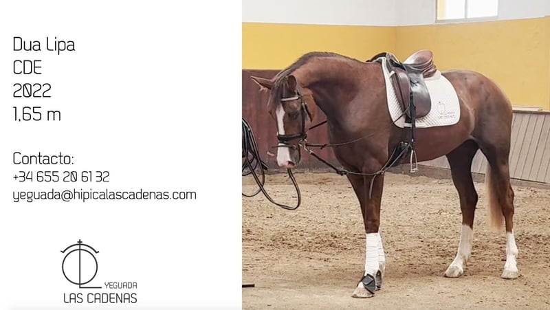Verkauf von CDE-Pferd! Lerne Dua Lipa kennen! Großes Potenzial und ausgezeichnete Bewegungen. Rasse: CDE Geburtsjahr: 2022 Höhe: 1,65 m Status: Stute Preis: 20.000 Dua Lipa ist eine Stute mit einer ausgezeichneten Konformation und Temperament, ideal, wenn deine Absicht ist, mit einem jungen Pferd zu konkurrieren und dich weiterzuentwickeln. Eingeführt in die klassische Dressur.