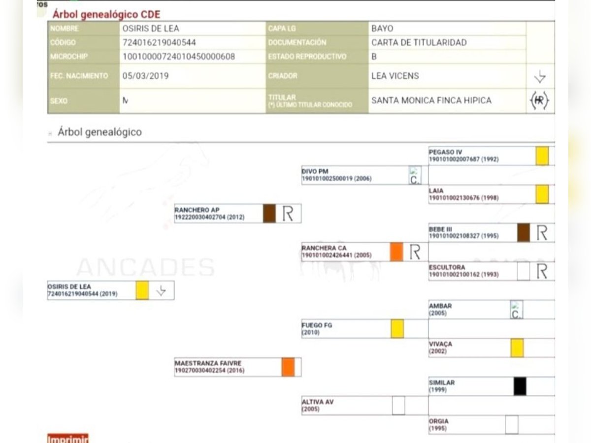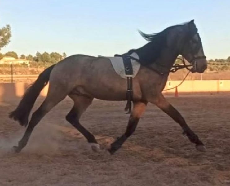 Caballo CDE con el Hierro de Lea VICENS. Unico Propietario desde Potro. Capa Exclusiva Bayo Oro. Edad 6 años y Medio. Talla 1,63 todavía en Crecimiento y Desarrollo. Dado de alta como Reproductor pero No a Cubierto. Carta CDE e Inscrito en ANCADES. Nieto del Famoso FUEGO FG Lusitano Bayo Faivre y Nieto del Famoso DIVO PM Padre RANCHERO AP PRE Hierro Peralta. Madre Maestranza LUSITANA Hierro Faivre. Montado, paso, trote, galope y realizando diferentes ejercicios de Doma Clásica, Cesiones, Apoyos, Transiciones y Posada. Iniciado en Cambios y Paso Español. Noble Noble lo montan niñas y adultos en Pista realizando diferentes ejercicios. Saliendo por la calle y campo de Paseos y Rutas solo o en Compañía, ideal para juveniles y Aficionados a la EQUITACIÓN. Se acepta Cualquier Revisión veterinaria y Pruebas PRE-Compra. Revisión Veterinaria, Documentación, boca hecha, Vacunas y desparasitado Ok. Se Acepta Periodo de PRUEBAS en la HÍPICA. Se Entrega Factura.