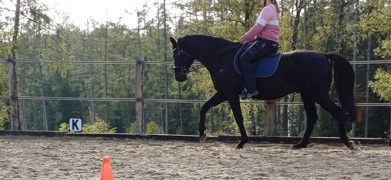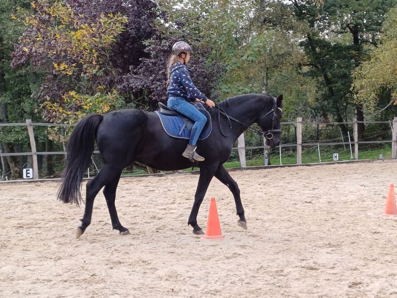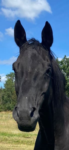 Menny ist ein 16-jähriger außergewöhnlich schöner und harmonischer Rappwallach (V: Trakehner Ovaro) der auf unserem Ponyhof seine Aufgabe nicht findet. Er braucht mehr Aufmerksamkeit und möchte viel öfter ins Gelände gehen oder auf dem Platz beschäftigt werden (Dressur, Stangenarbeit, Bodenarbeit, Longieren,…) Menny ist aufgrund seiner schwungvollen Bewegungen und seines großrahmigen Galopps kein Anfängerpferd. Bis auf eine witterungsbedingte Erkältung durch das Leben in der robusten Ponyherde war er hier seit 8 Jahren immer fit. Aktuell wird er im Winterhalbjahr im Offenstall und auf der Weide eingedeckt. Er läuft barhuf, kennt aber auch Eisen oder Hufschuhe. Er hat drei gute Grundgangarten und geht problemlos allein ins Gelände. Menny sucht seinen Herzensmenschen, der ihm mehr Zeit widmen kann. Für uns ist eine artgerechte Haltung und ein fairer Umgang mit dem Pferd letztendlich wichtiger als der Preis. Zubehör kann mit übernommen werden. Um Reittourismus zu vermeiden, nehmen wir für das Probereiten 40€.