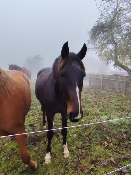 Unfortunately, we cannot keep all of them either. We are a small hobby breeder and only keep our mare foals. Clemens was born in 2022 and has grown up robustly within a herd. His sire is Castello Branco, who has achieved great success up to S*** level. His dam, Delaynie, was also born with us and has competed up to S* level in show jumping with our daughter. Delaynie is a half-bred mare by Domenico xx out of a Ferman-Lonely Boy-Landgraf-Indentat mare line. Clemens was our first foal and is currently approximately 160 cm tall, so not the tallest. As a gelding, he will still grow a few more centimeters, but there are also smaller riders out there. He is looking for HIS person—someone who has the time to work with him and develop him further. He is still quite raw, has been lunged, and is familiar with free jumping. For more information, please contact 01772423528. Please only get in touch if you are genuinely interested; anything else is a waste of time.