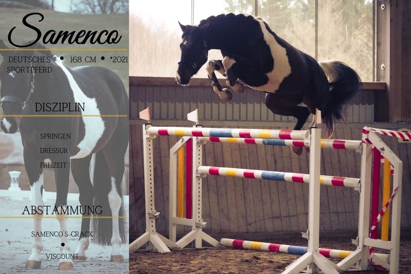 Samenco ist ein 2021 geboreners Deutsches Sportpferd v. Samenco´s Crack, Samber, Lestotho x Viscount, Asculep *Samenco* bringt enormes Vermögen, ein bildschöne Optik sowie ein super Charakter mit sich. Er ist absolut unkompliziert, wird gerade auf das anreiten vorbereitet. Er ist super einfach und sehr unerschrocken und cool bei allem. Hat eine super Technik am Sprung und 3 sehr gute GGA dazu. Ein Allrounder der in beiden Bereichen glänzen kann und dazu für einen tollen Ausritt zu haben ist. Er bringt einen gute AKU mit. Stand problemlos über den Sommer 24/7 im Offenstall auf der Wiese in einer gemischten Herde. Nun wurde er zum anreiten eingestallt, dies ist für ihn auch kein Problem. Longieren, Satteln, Trense, longieren, waschen etc. sind kein Problem. Preis steigend bei weiterer Ausbildung. Pferdehandlung Dederichs – Ihr Partner für den Pferdekauf Kontakt & Erreichbarkeit: Anfragen bitte ausschließlich telefonisch unter 0173/9792139 Montag – Freitag: 09:00 – 18:00 Uhr Samstag: 09:00 – 15:00 Uhr Sonntag: Ruhetag Folgen Sie uns auf Social Media! Erleben Sie unseren Alltag mit den Verkaufspferden auf Instagram, TikTok & Facebook unter Pferdehandlung Dederichs Rabatt: Bei sofortiger Mitnahme Ihres neuen Traumpferdes erhalten Sie zwischen 5 %– 10 % Rabatt Probereiten & Vorführen: • Probereiten: 30 € pro Pferd (max. 2 Reiter), Betrag wird beim Kauf angerechnet • Feiertage: Proberitt 50 € • Vorführung durch unsere Bereiter: 25 € pro Pferd (Vorreiten, Bodenarbeit etc.) Ankaufsuntersuchung & Transport: • Viele unserer Pferde besitzen bereits eine AKU • Sie können selbstverständlich Ihren eigenen Tierarzt mitbringen • Gerne organisieren wir eine Untersuchung • Wir unterstützen Sie auch gerne beim Transport ins neue Zuhause Weitere Verkaufspferde: In unserem Stall stehen weitere Verkaufspferde, die noch nicht online sind. Falls Ihr Traumpferd noch nicht dabei ist, zögern Sie nicht, uns zu kontaktieren. Wichtige Hinweise: • Stockmaß-Angaben sind geschätzt und nicht exakt nachgemessen • Alle Beschreibungen sind subjektive Einschätzungen des Verkäufers und keine zugesicherten Eigenschaften Weitere Informationen finden Sie unter: www.Pferdehandlung-Dederichs.de