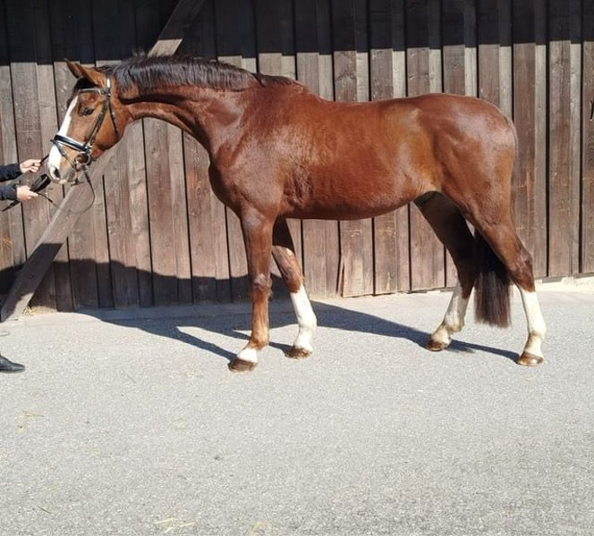 Ben Hur ist ein 4jähriger Dunkelfuchs aus eigener Zucht. Besonders vorzuheben ist sein ausgeglicherner Charakter. Er wurde Anfang 2025 sorfältig im Landesleistungzentrum Ansbach angeritten und darf seit Mitte April noch einen Saison in der Herde auf der Koppel verbringen. Leider müssen wir uns von unserem Herzenspferd trennen, da er bei uns nicht seinem Potenzial ensprechend gefördert werden kann. Seine Halbschwester aus der gleichen Mutter geht erfolreich in der Klasse S.