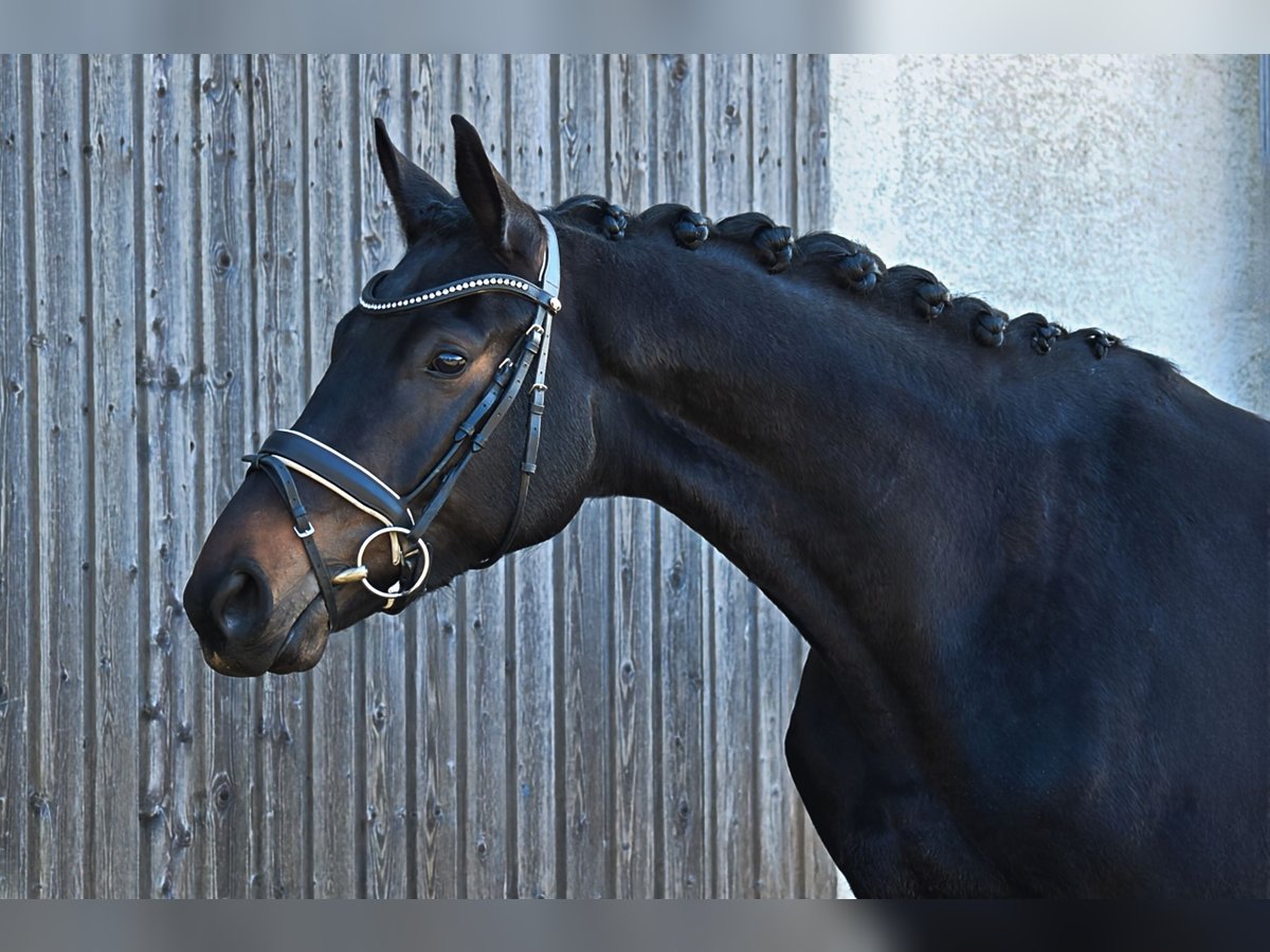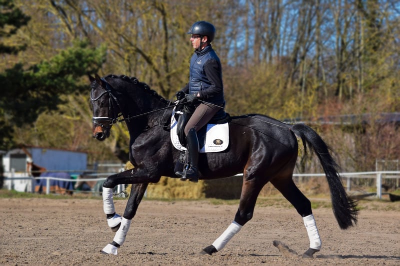 Zum Verkauf steht ein vierjähriger Wallach in dunkler Jacke mit einem sehr ausgeglichenen Temperament und hoher Rittigkeit. Ca ein halbes Jahr unter dem Sattel zeigt er sich bereits ausbalanciert mit drei sehr guten Grundgangarten, wobei der Galopp besonders hervorzuheben ist. Er ist leicht zu reiten, sowohl in der Halle, als auch auf dem Platz. Auch von Amateuren ist er einfach zu bedienen. Vater Rapolino war selbst erfolgreich im Springsport unterwegs, hat aber auch zahlreiche Nachkommen, die in der Dressur unter anderem bis Inter I siegreich sind. Mutter Della Casa brachte sowohl bis Inter II platzierte Nachkommen, als auch welche, die bis 1,20m Springen erfolgreich sind. Sehr gute Röntgenbilder liegen vor.