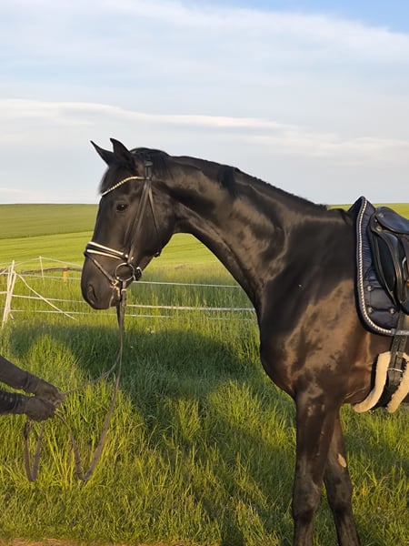 Dieser großrahmige, noch im Wachstum stehende Wallach ist ausgestattet mir drei guten und takt sicheren Grundgangarten. Dabei ist besonders sein raumgreifender und immer absolut taktsicherer Schritt hervorzuheben. Abstammend von Don Nobless x San Armour ist dieser Wallach noch ganz am Anfang seiner Ausbildung und zeigt sich dabei immer lieb im Umgang und ohne Unarten. Er wurde spät und schonend angeritten aufgrund seiner Größe. Er kennt das Reiten und Arbeiten in der Halle und auf dem Platz und war schon an der Hand ins Gelände spazieren. Dabei ist er brav sowohl allein als auch mit anderen Pferden gemeinsam. Er ist schmiede fromm, ist derzeit noch unbeschlagen aufgrund guter Hufqualität. Er lässt sich natürlich auch gut verladen und kennt Hänger und Transporter. Dieses Rohjuwel wird aus persönlichen Gründen und wegen Arbeitsplatzwechsel verkauft. Aufgrund eines kleinen einzelnen Chipbefundes bei ansonsten einwandfreiem TÜV wird er außerdem unter Wert angeboten.