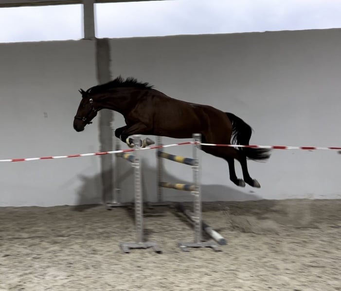 For sale is a 5-year-old gelding by Cheetano (Coriano x Capitol II) with a height of 166 cm. Charlie started his first show jumping test at class A in April of this year and was able to place immediately. He has been successful in show jumping A* and has been presented in show jumping A**. In the course, he shows himself to be eager to perform, brave, and with good overview – when he receives the necessary confidence from the rider, he jumps everything. He is light to ride. Due to his pedigree, he may also be interesting for dressage. In daily handling, Charlie is sweet and sensitive and, due to his age, is not a pure beginner's horse. He needs an empathetic, patient person who provides him with consistent guidance and takes their time. Then he shows himself to be very cooperative and willing to perform. He is naturally shoe-friendly and loading-friendly, knows trail riding both alone and in a group. No known health deficiencies. A vet check from 12/24 is available, including X-rays. Videos and competition name available upon request. He is offered exclusively to loving, supportive hands.