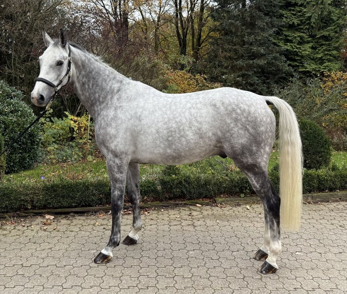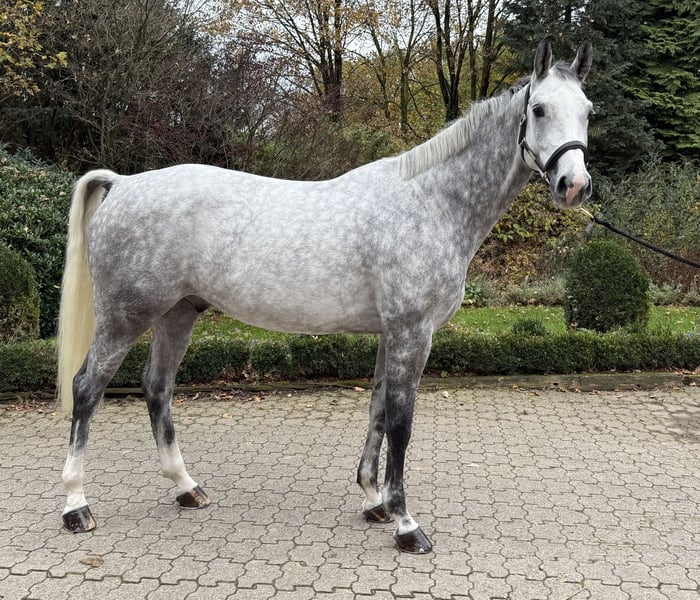 Zum Verkauf steht ein 5 jähriger schöner Apfelschimmel - ideal für ambitionierte Reiter. Der Wallach überzeugt durch seine ansprechende Optik und sein vielseitiges Talent im Springen. Mit einem Stockmaß von 169 cm bietet er die perfekte Größe für sportliche Reiter, die auf der Suche nach einem zuverlässigen Partner für den Turniersport sind. Der Wallach verfügt über eine gute Grundausbildung und zeigt viel Potenzial für seine weitere Turnierlaufbahn im Springsport Wir waren mit ihm auch schon international unterwegs, dort konnte er 115cm gewinnen und sich mehrfach platzieren. Sein freundliches Wesen und seine Bereitschaft, Neues zu lernen, machen ihn zu einem tollen Begleiter im Training und auf Turnieren. Der hübsche Wallach lässt sich problemlos verladen und ist auch auf Turnieren sehr entspannt. Er kommt täglich mit einem weiteren Pferd auf die Wiese und kennt die Führmaschine. Auch beim Schmied benimmt er sich vorbildlich. Bei Interesse und für weitere Informationen stehe ich gerne zur Verfügung. Probereiten ist nach Vereinbarung möglich.