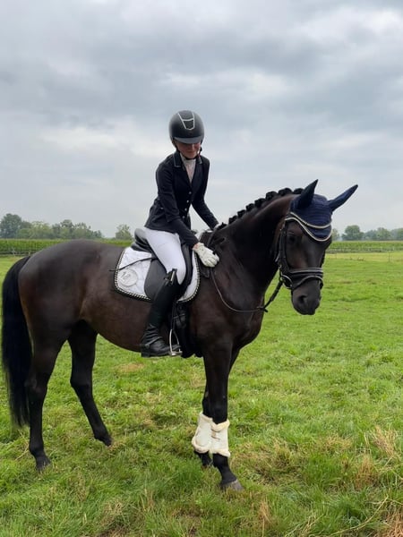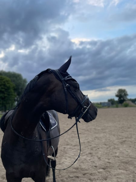 6-year-old gelding by Finest x Pentagon's Peron – stunning, well-mannered & promising, 1.70 m, double talent, hunter This stunning 6-year-old gelding (Finest x Perron) captivates with his charming presence and a friendly character. Under saddle, he is rather a calm type and reliably goes through the neck even with less experienced riders. He jumps courses with joy and good overview. He has already been presented and placed at smaller competitions. It is with a heavy heart that I part with him for professional reasons, and I wish for him a nurturing, loving home where he can reach his full potential. Fun fact: Due to his exceptional beauty, he has earned the nickname "Louis Vuitton Handbag" – he is truly a luxury piece for riders looking for a quality and unspoiled young horse or for less experienced riders who want to develop with a horse under proper guidance. At 1.70 m, he can almost fit under your arm!