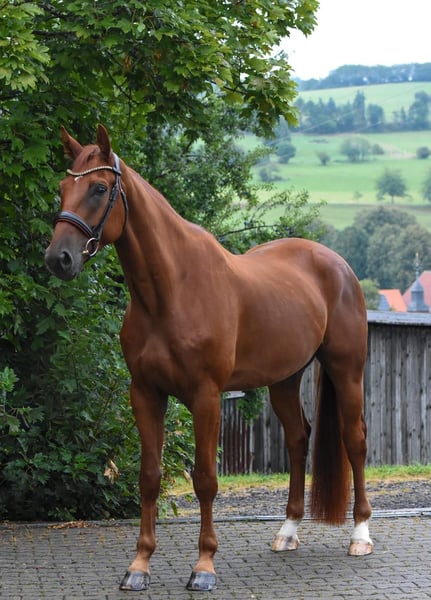 Don Cajano ist ein 6 jähriger Wallach ca. 1,72 groß, abstammend von Don Royal aus einer Quaterback Stute. Er verfügt er über qualitätsvolle GGA und einer guten Ausstrahlung unter dem Sattel. Er befindet sich momentan auf Dressurpferde A-L Nivau ist sehr rittig und er hat Spaß an der täglichen Arbeit und ist stets motiviert. Don ist schmiede- und verladefromm. Aktuell ist er rundum beschlagen, ist regelmäßig entwurmt und war vor kurzem beim „Zahnarzt“. Im Umgang ist er brav und menschenbezogen. Aktuell ist er in Beritt und lernt täglich dazu. Video unter dem Reiter gerne auf Anfrage. Direkt von dem Aufzüchter