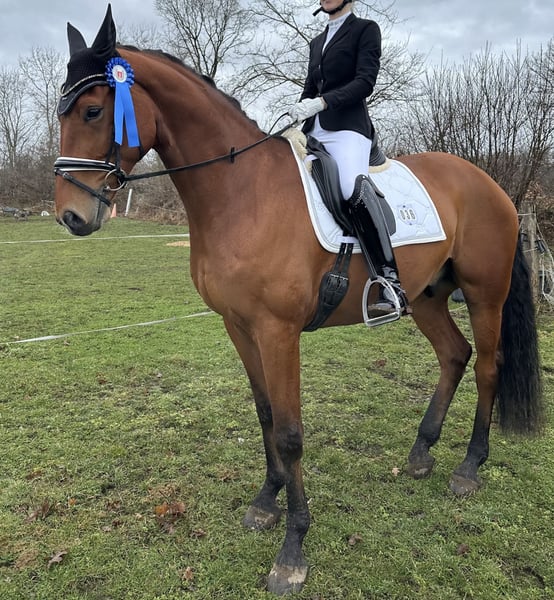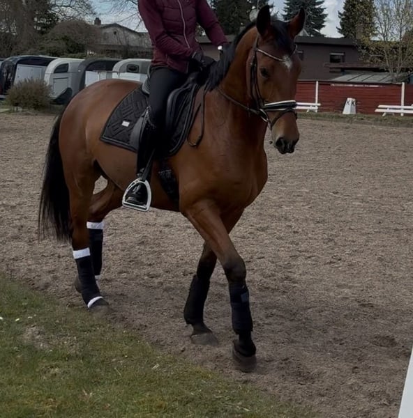 For sale: My tall, elegant bay German Sport Horse gelding from the Moritzburg State Stud, born in 2020. With an impressive height of approximately 17.4 hands, this dressage-bred gelding combines a lovely size with great potential for competitive riding. Well-trained and well-ridden, he demonstrates a promising basic dressage foundation and impresses with his calm demeanor, willingness, and talent for quickly learning new movements. He made an immediate impression at his first competition, where he was placed. Thanks to his excellent pedigree and pronounced movement potential, he is ideally suited for an ambitious rider seeking a reliable and talented dressage partner. A true talent suitable for both advanced amateurs and the higher levels of competition. He is also suitable for hacking out in the field. Sometimes, perhaps age-appropriately a bit shy, but always manageable. Overall, he is very sensible and a true sweetheart in handling. This very gentle young horse is manageable even for beginners, but due to his age, not recommended for complete novices. No vices. No health issues. Price reflects his quality. To prevent riding tourism, a €50 fee will be charged for trial rides, which will be deducted from the purchase price if bought.