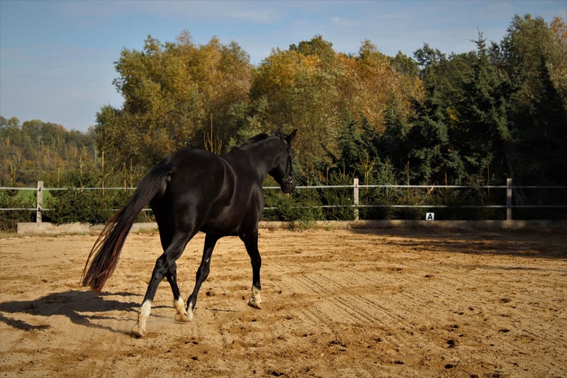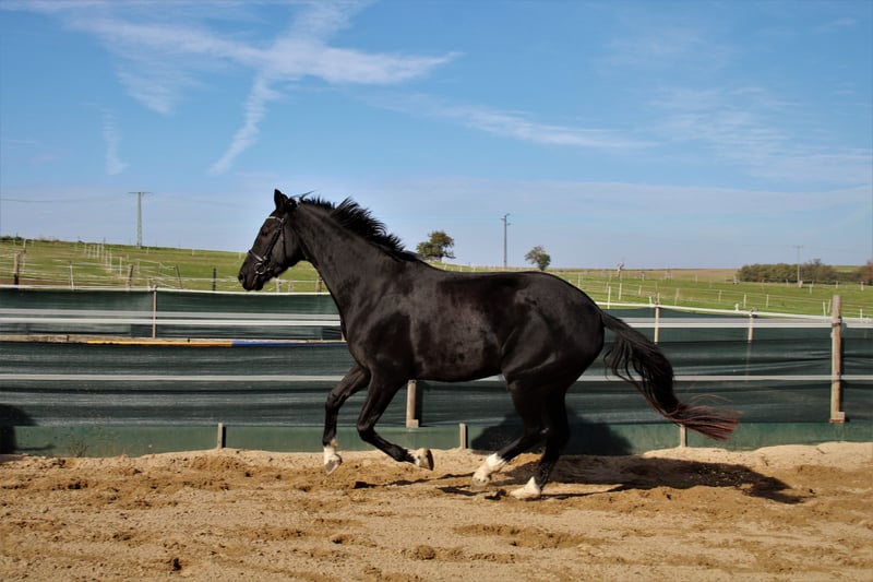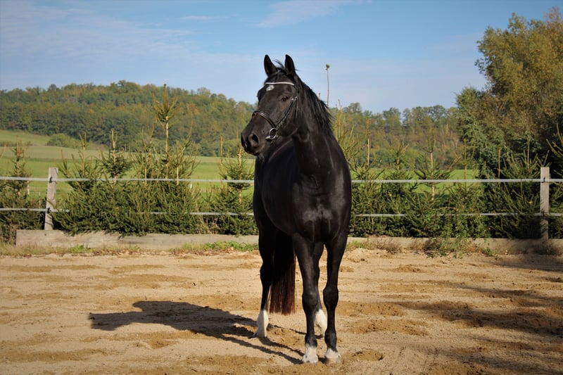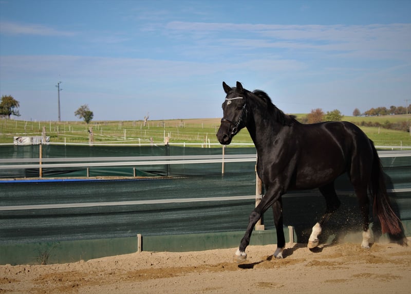 Aus familiären Gründen und Aufgabe der Sportpferdehaltung haben wir uns entschlossen, diesen besonderen , mit viel Ausstrahlung und hervorragender Bewegungsqualität ausgestatteten Wallach zu verkaufen. Sein Vater "Decurio" brachte u. a. die Bundeschampions und Weltmeister "Da Vincy" und "Rubina Black" im Fahrsport hervor. Dieser bildschöne, statiöse Rappe ist im April 2019 geboren und ca. 175 cm groß. Derzeit lebt er in Offenstallhaltung mit 24/7 Weidegang, kennt jedoch auch Boxenhaltung mit viel Auslauf. Zu anderen Pferden zeigt er sich als freundlicher und respektvoller Koppelpartner. Er war zwischen dem 2. und 3. Lebensjahr in Hengstaufzucht, ist menschenbezogen, arbeitsfreudig, neugierig und sehr sensibel. Regelmäßige Kontrolle der Zähne, Impfungen, Wurmkuren und Hufkorrekturen sind für uns selbstverständlich. Aufgrund seiner Sensibilität braucht er einen erfahrenen, feinfühligen Ausbilder, der ihm die Zeit und Aufmerksamkeit gibt, die er benötigt, um ihn gezielt zu fördern. Bisher wurde er wegen eines Röntgenbefundes und Zeitmangel nur anlongiert. Dabei war er sehr kooperativ und lernwillig. Preis ist verhandelbar bei Besichtigung des Pferdes! Der Wallach wird als "roh" verkauft, es gilt "Platz vor Preis". Für weitere Informationen und bei ernsthaftem Interesse kontaktieren Sie uns bitte gern. Wir beantworten jedoch nur vollständige Sätze! Wir freuen uns darauf, den passenden Menschen für dieses besondere Pferd zu finden.