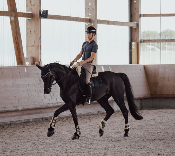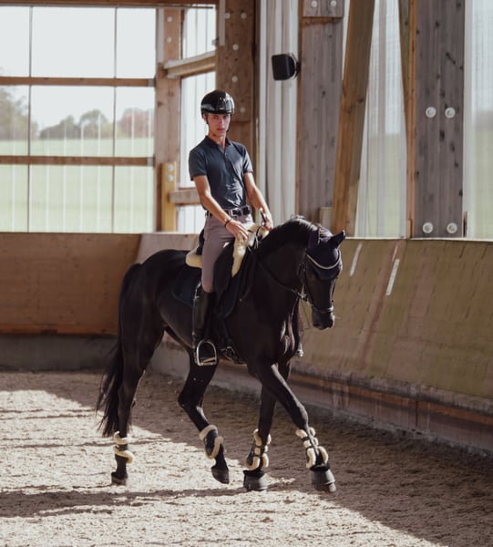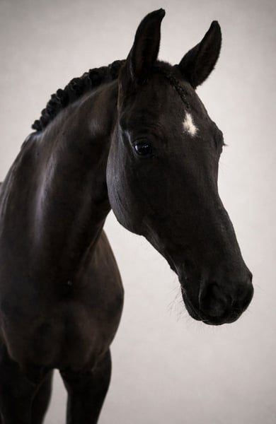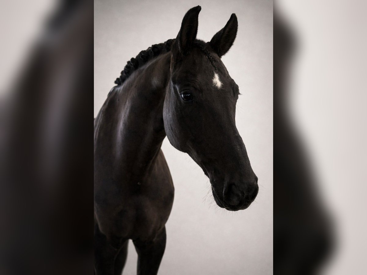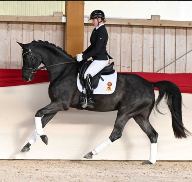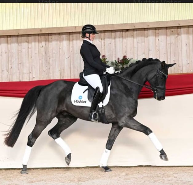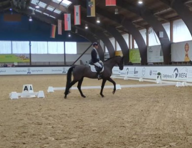 Wir verkaufen im Auftrag der Besitzer diesen 2018 geborenen Rapp Wallach von Baron x Samarant x Donnerhall. „Brillant" ist ein spitzen Dressurpferd ohne wenn und aber. Ende 4 jährig wechselte er hochpreisig über die Verbandsauktion des DSP zu seiner jetzigen Besitzerfamilie. Die letzten Jahre wurde er dort weniger stark gefördert und überwiegend von der Tochter geritten, was er trotz des noch relativ jungen Alter bestens funktioniert hat. Nun befindet er sich seit etwas mehr als einem halben Jahr wieder in professionellen Beritt und wird immer sicherer in den Lektionen der Klasse L. Brillant überzeugt mit drei durchweg sehr guten Grundgangarten. So wurde er 4jährig gleich zweiter in seiner ersten Reitpferdeprüfung mit Noten bis 8,5. Momentan ist er auf sehr sicherem A-Niveau und ganz aktuell (Mitte Februar) auch auch gegen sehr starke Konkurrenz in Darmstadt Kranichstein platziert. Er beherrscht bereits ziemlich sicher den Außengallop und Kurzkehrt. Einem erfolgreichen Start in der Klasse L sollte dieser Saison nichts im Wege stehen. Wenn man ihm noch etwas Zeit für Kraftaufbau gibt, damit er seinen Körper optimal einsetzen kann, wird man es noch sehr weit mit ihm bringen. Er ist ein Rohdiamant der noch weiter geschliffen werden möchte und für seine 8 Jahre absolut unverbraucht. Sein gekörter Halbbruder DSP Define Dynamic (v. Danciano) ist mittlerweile S siegreich mit Helen Langehaneberg und gewann unter Lisa Horler dreijährig das Würtemberger und das Süddeutsche Landeschampionat, vierjährig holte er dort nochmal Bronze. Auch im Umgang ist Brillant ein echtes Goldstück: Waschplatz, Schmied und Verladen meistert er ohne Probleme. Selbst alleine ins Gelände stellt mit ihm keine große Herausforderung da. Wir denken er passt am besten zu einem Amateur, der Spaß an vielseitiger Dressurarbeit hat und ein richtiges Spaßpferd sucht. Ein älterer TÜV liegt vor, ein neuer kann gerne bei Intresse gemacht werden. Wir freuen uns auf Ihre Kontaktaufnahme und schicken bei Interesse gerne noch weitere Bilder und Videos!
