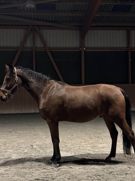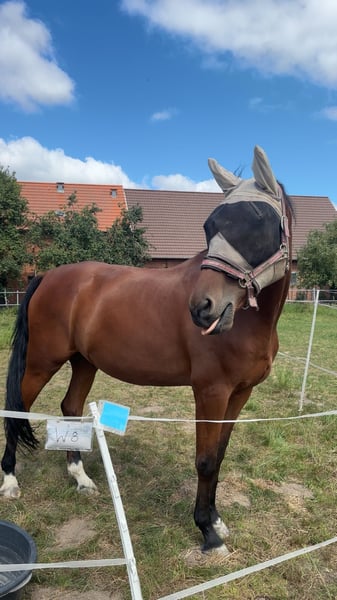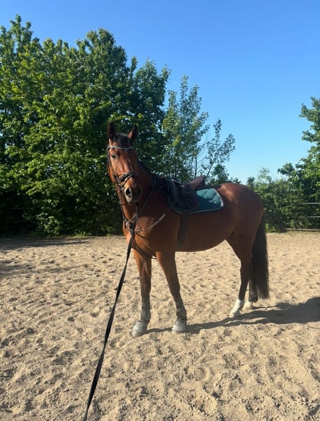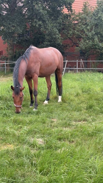 Sportwallach | 8 Jahre | ca. 175 cm | von Valerio x Lordanos Van Helsing, auch Valdanos genannt ist ein super verschmustes Sportpferd mit einem sehr ausgeprägten Lerndrang, welcher seit August 2023 in unserem Besitz ist. Er besitzt drei schwungvolle Grundgangarten und einen tollen Sprung, ohne Verweigerungen. Außerdem ist er ein aktives Pferd, was sich gerne bewegen möchte. Er ist super geeignet für Ambitionierte Reiter und wird auch in hohen Springklassen nicht enttäuschen. Im Gelände und neuen Umgebungen zeigt er sich unerschrocken und sicher, angst vor etwas hatte er bisher noch nie. Valdanos braucht jemanden der ihm täglich Abwechslung und Bewegung ermöglicht, damit er konzentriert und gelassen mitarbeitet. Für Anfänger, ist er nicht geeignet, da er einen unerschrockenen Reiter braucht, auf den er sich verlassen kann und der sich ggf. auch durchsetzt. Außerdem ist er mit "Gefühl" zu Reiten, also keine großen Krafteinwirkungen. Er wurde von der Vorbesitzerin bereits auf Turnier vorgestellt und konnte dort auch überzeugen. Er ist ein extrem verträgliches Pferd und hat sich bisher mit jedem Pferd verstanden, er steht in der Rangordnung recht mittig. Grundsätzlich ist er sehr verspielt sowohl mit Pferden, als auch mit Menschen, er kennt aber seine Grenzen. Sein Zubehör (Angepasster Sattel im sehr guten Zustand, Trense und alles was man so braucht) kann gegen einen Aufpreis mit gekauft werden. Geplant war, dass er für immer bei uns bleibt, was wir aber leider Zeitlich und unseren Umständen entsprechend nicht mehr gewährleisten können. Wir wünschen uns das er jemanden findet, der ihn weiter fördert und mehr Zeit für ihn hat. Gerne per Mail, oder WhatsApp melden, es werden alle Fragen beantwortet und gerne auch mehr Bilder und Videos gezeigt. talisa.juelke@gmail.com +49 176 55914887