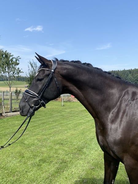 This 8-year-old black gelding is a true exceptional horse – not only under saddle but also in daily handling. He combines athletic quality, impressive rideability, and striking beauty – including a charming white heart on his forehead. However, what makes him truly special is his outstanding character, making him a real lifesaver on four hooves. His reliability, nerve strength, and fine sensitivity to the rider provide an exceptionally secure riding experience – in every situation. Whether in the arena, on the field, during trail rides, or in everyday life: he is trustworthy. What fascinates me the most is his enormous eagerness to learn and his willingness to develop further every day. He approaches new lessons with curiosity and ease, always remaining motivated, focused, and cooperative. His relaxation and fine connection make daily work with him a pleasure. With three very good, rhythmic basic gaits, he offers the best prerequisites for advanced dressage sport. He has already been successful multiple times in dressage horse tests of class M and is currently trained up to class S, making him perfect for ambitious juniors, those transitioning from ponies to large horses, or riders looking for a correctly trained, reliable, and easy-to-ride partner. Due to his character and exceptional rideability, he would also be suitable for beginners. He also shows talent and joy in jumping – but has not yet been promoted in competitions. With his clear rideability, calm temperament, and the high level of trust he conveys, he is a true soulmate – and an investment in many carefree years in the saddle. Only to the very best hands!! Quality over price!! Further videos, information, and photos available upon request. Trial rides possible at any time.